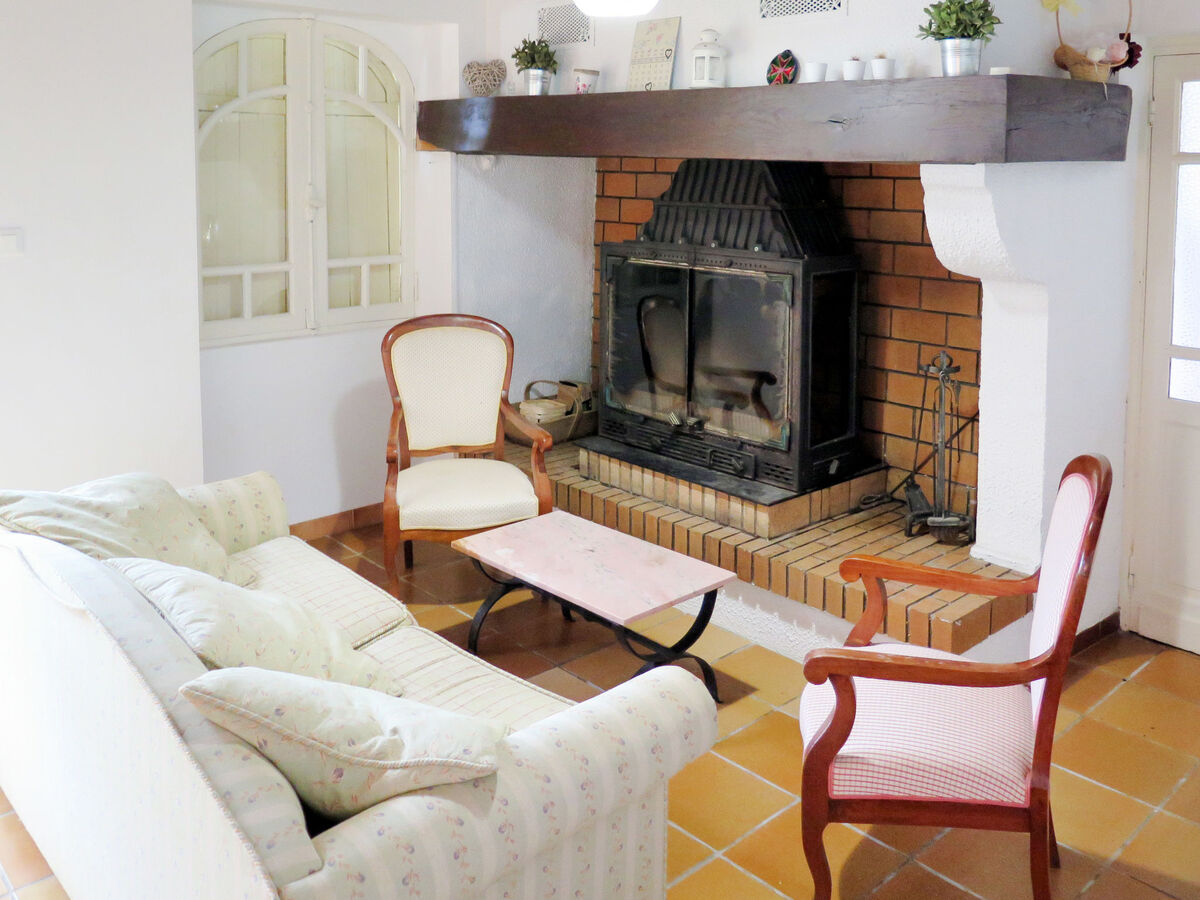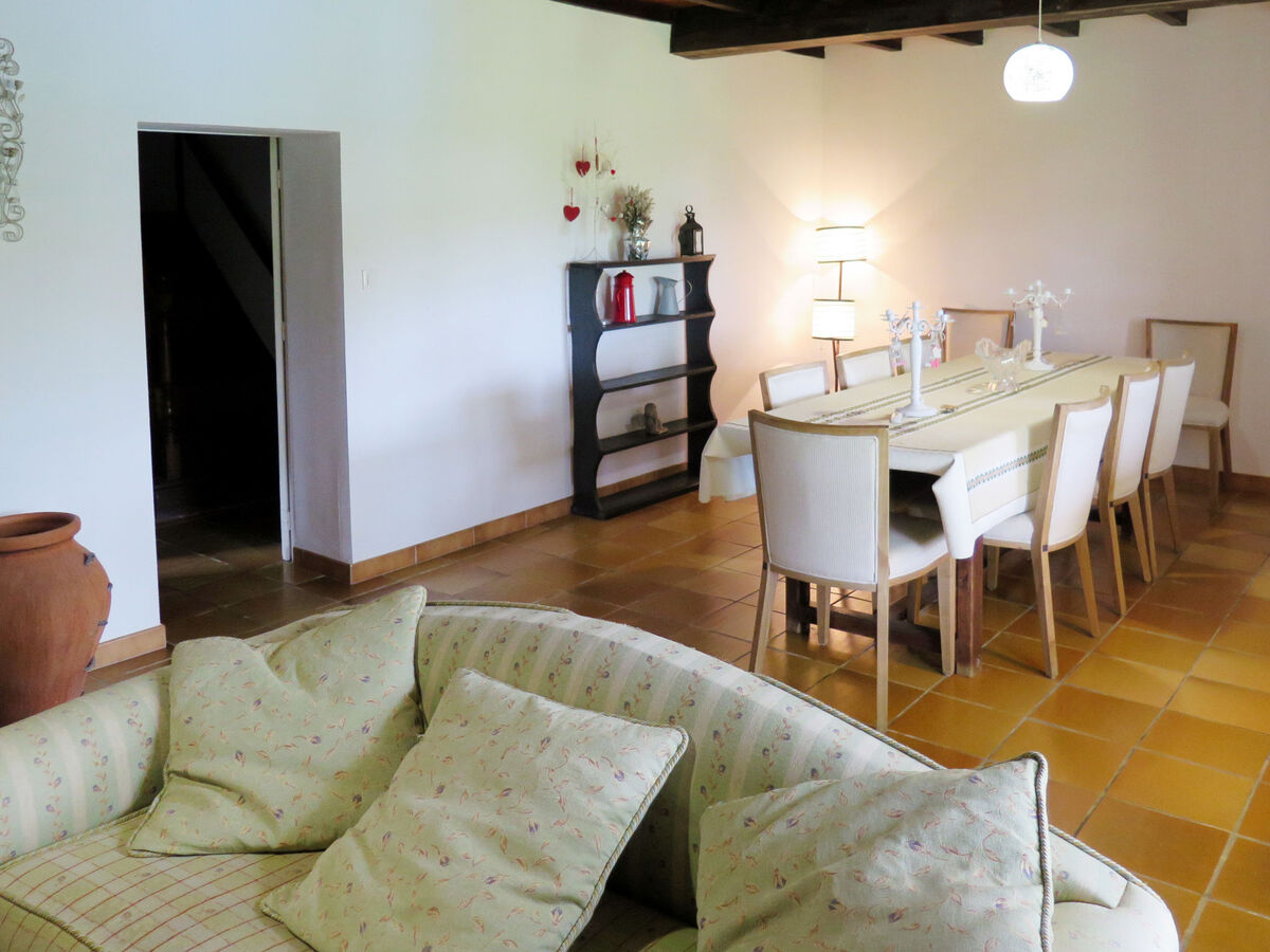Clair, aménagement de bon goût: séjour/salle à manger avec table pour les repas et poêle à bois.