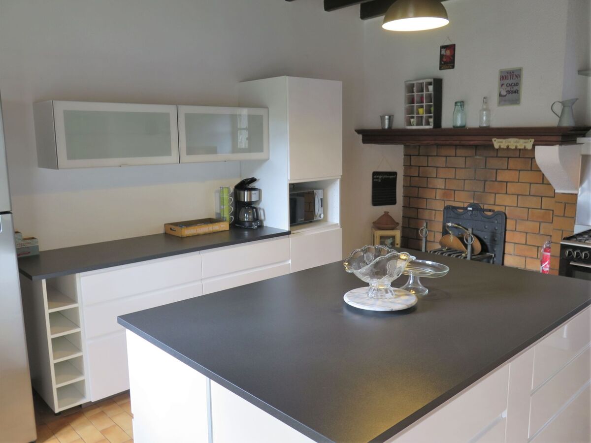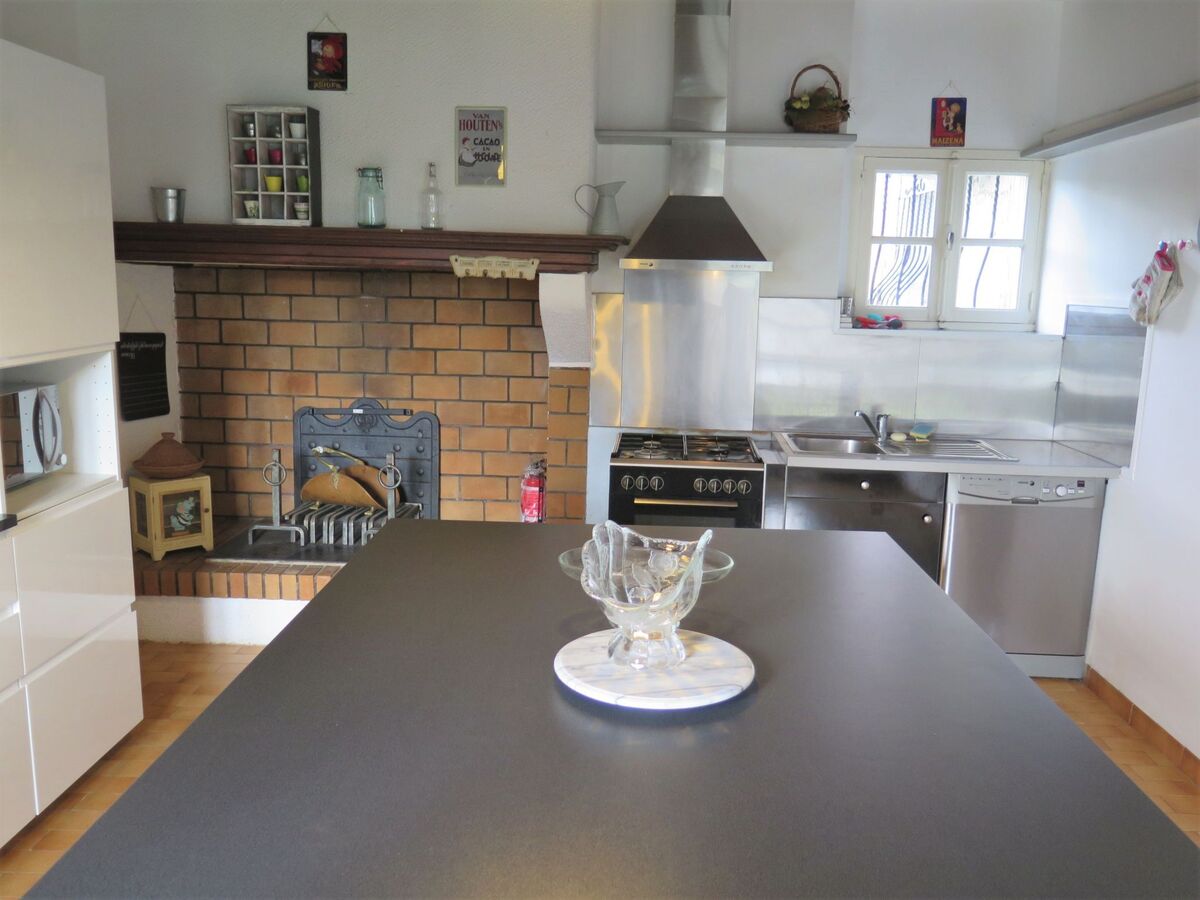 Cuisine (four, lave-vaisselle, 4 feux, grille-pain, bouilloire électrique, micro-ondes, congélateur, cafetière électrique) avec petite table pour les repas.