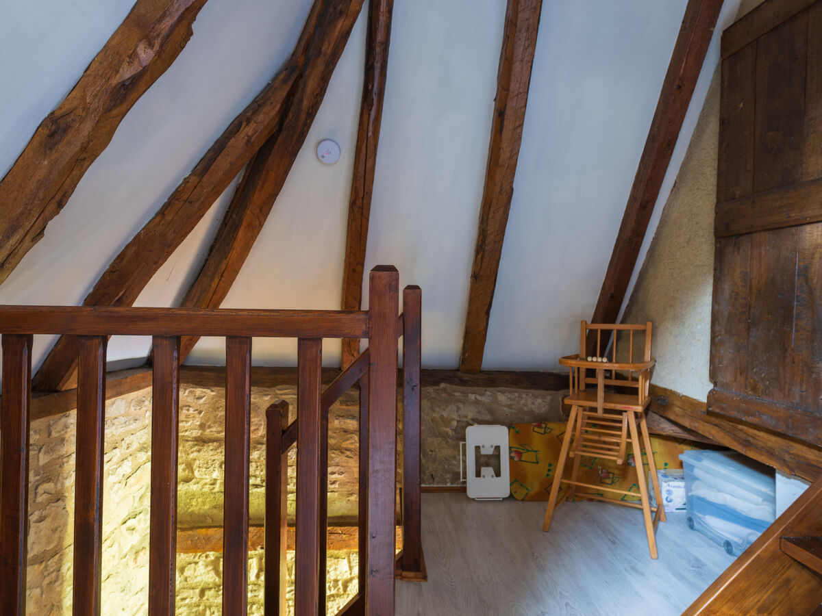 À l'étage supérieur: 1 chambre, mansardée avec 1 grand-lit (140 cm, longueur 190 cm).