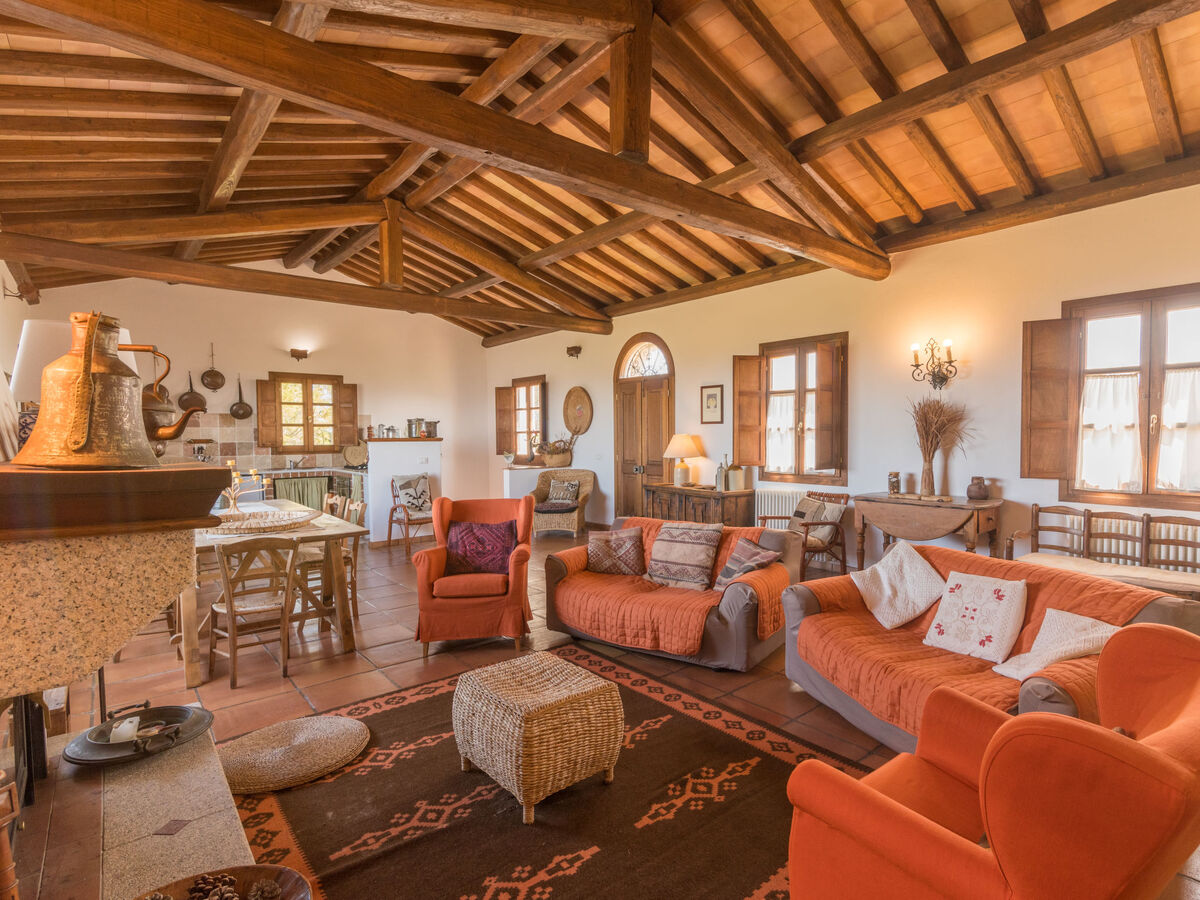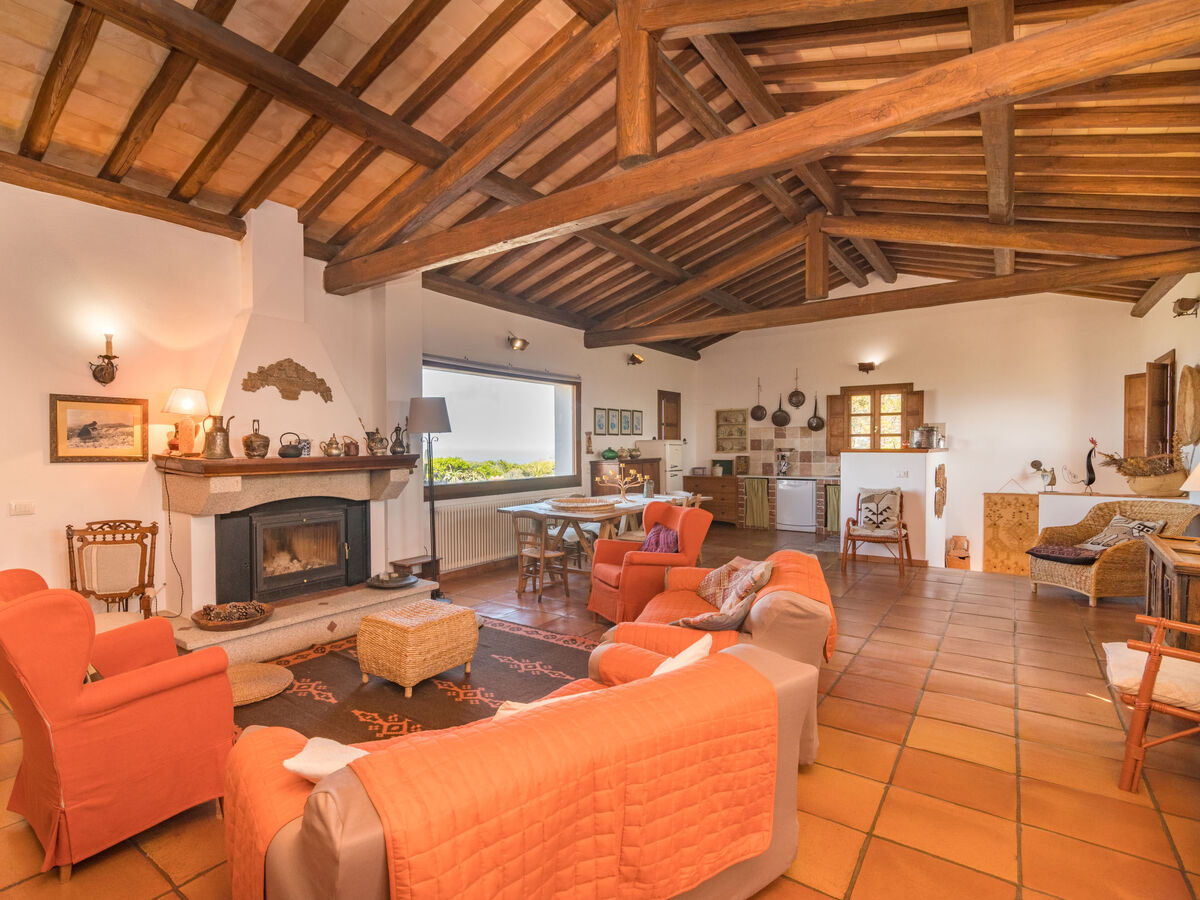 Aménagement rustique et de bon goût: grand séjour/salle à manger avec cheminée, table pour les repas et TV (satellite).