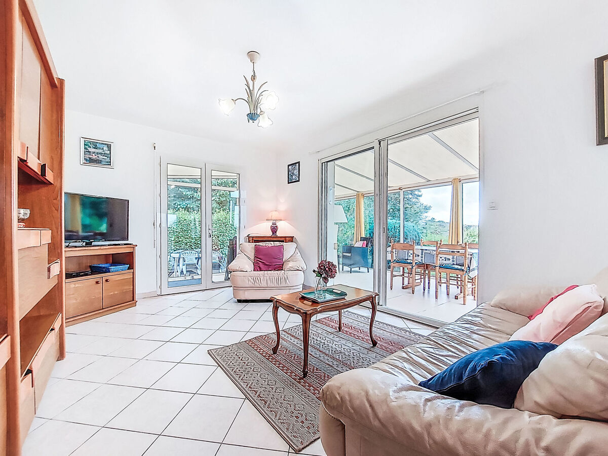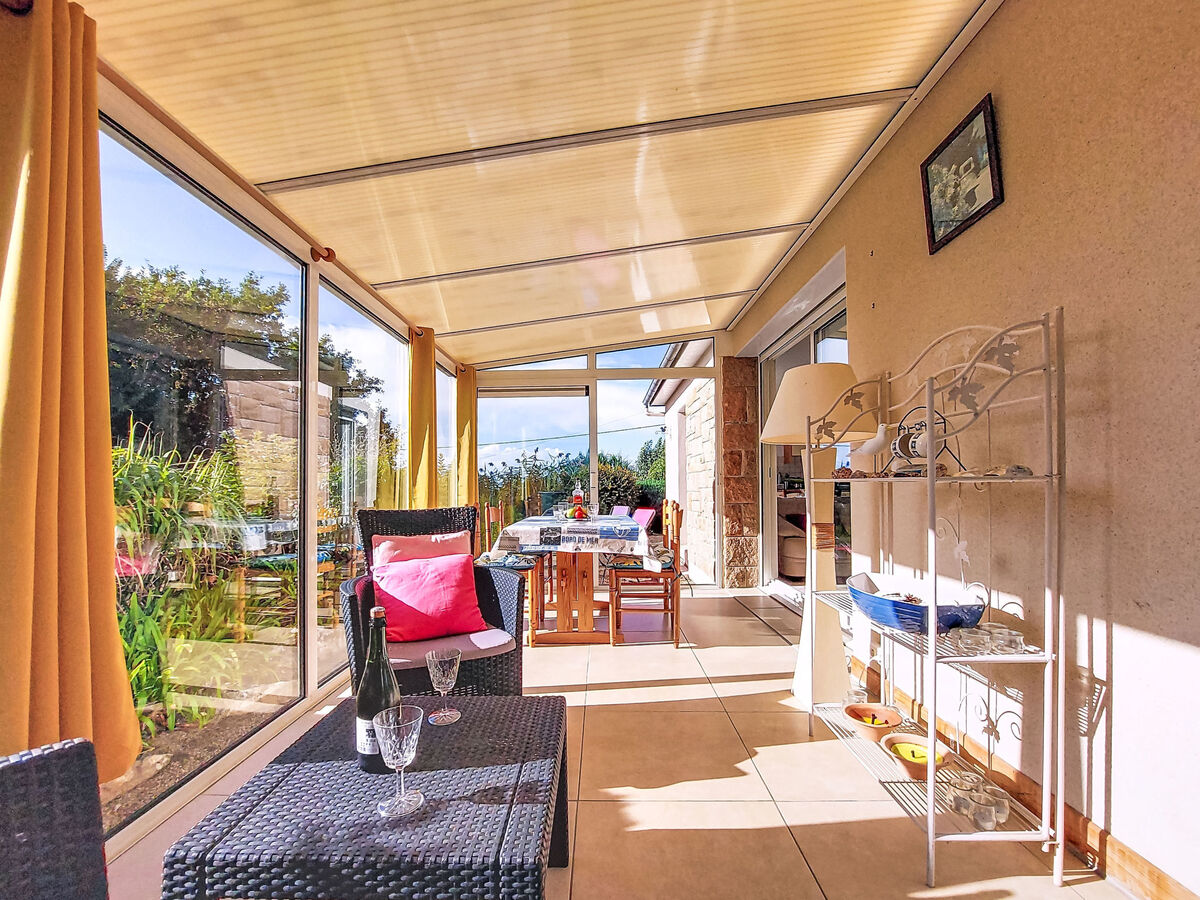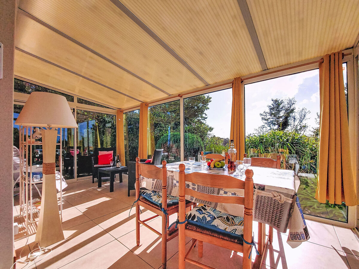 Clair, aménagement agréable et plaisant: séjour avec véranda avec table pour les repas et TV.