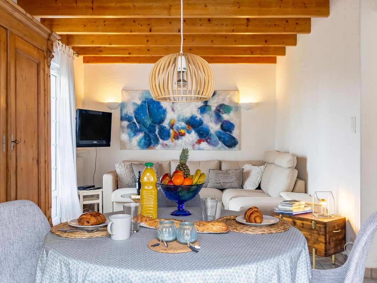 Aménagement confortable et de bon goût: séjour/salle à manger avec table pour les repas, TV (satellite) et chaînes de TV internationales.