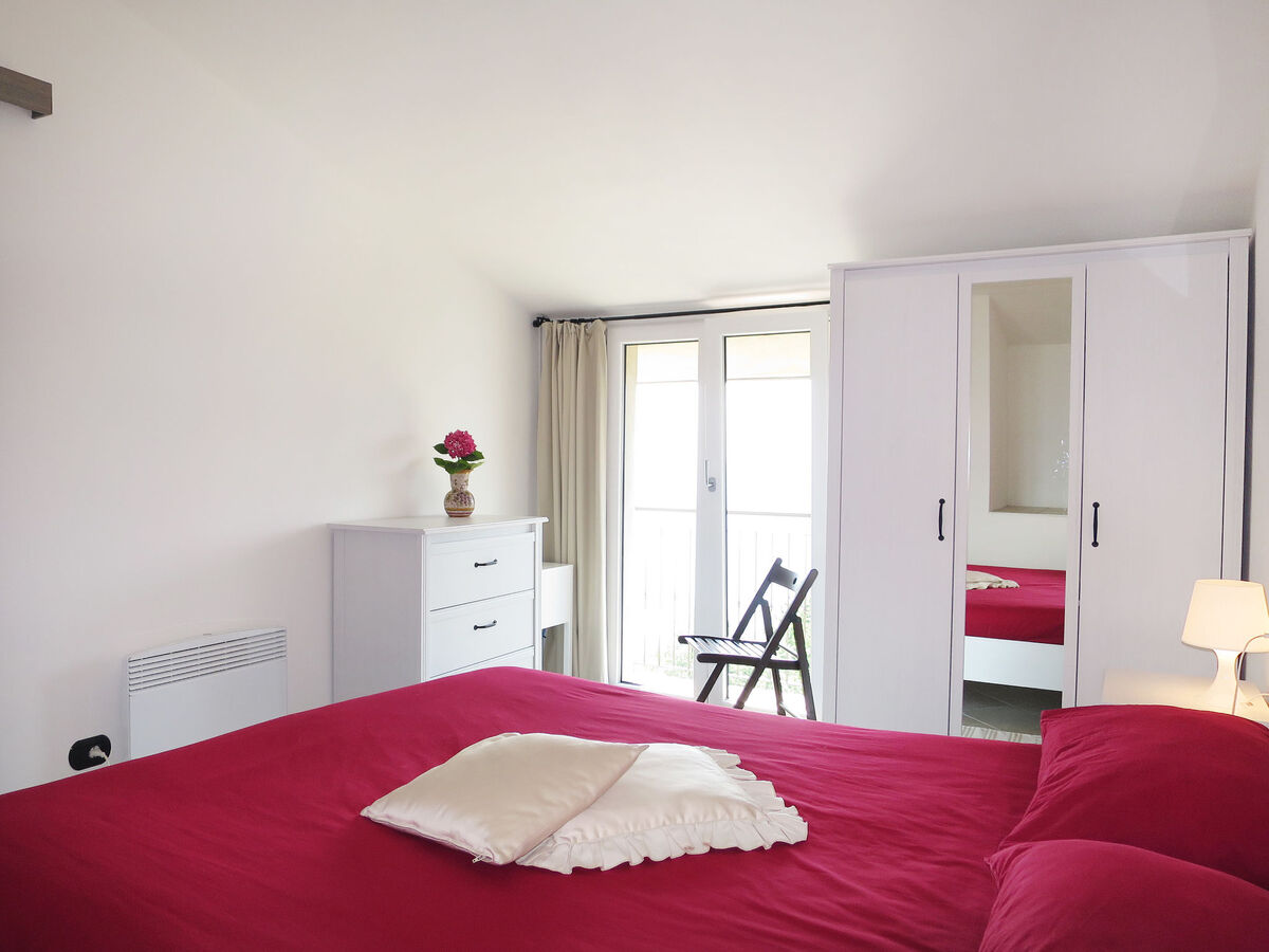 À l'étage supérieur: 1 chambre, mansardée avec 1 grand-lit (160 cm).