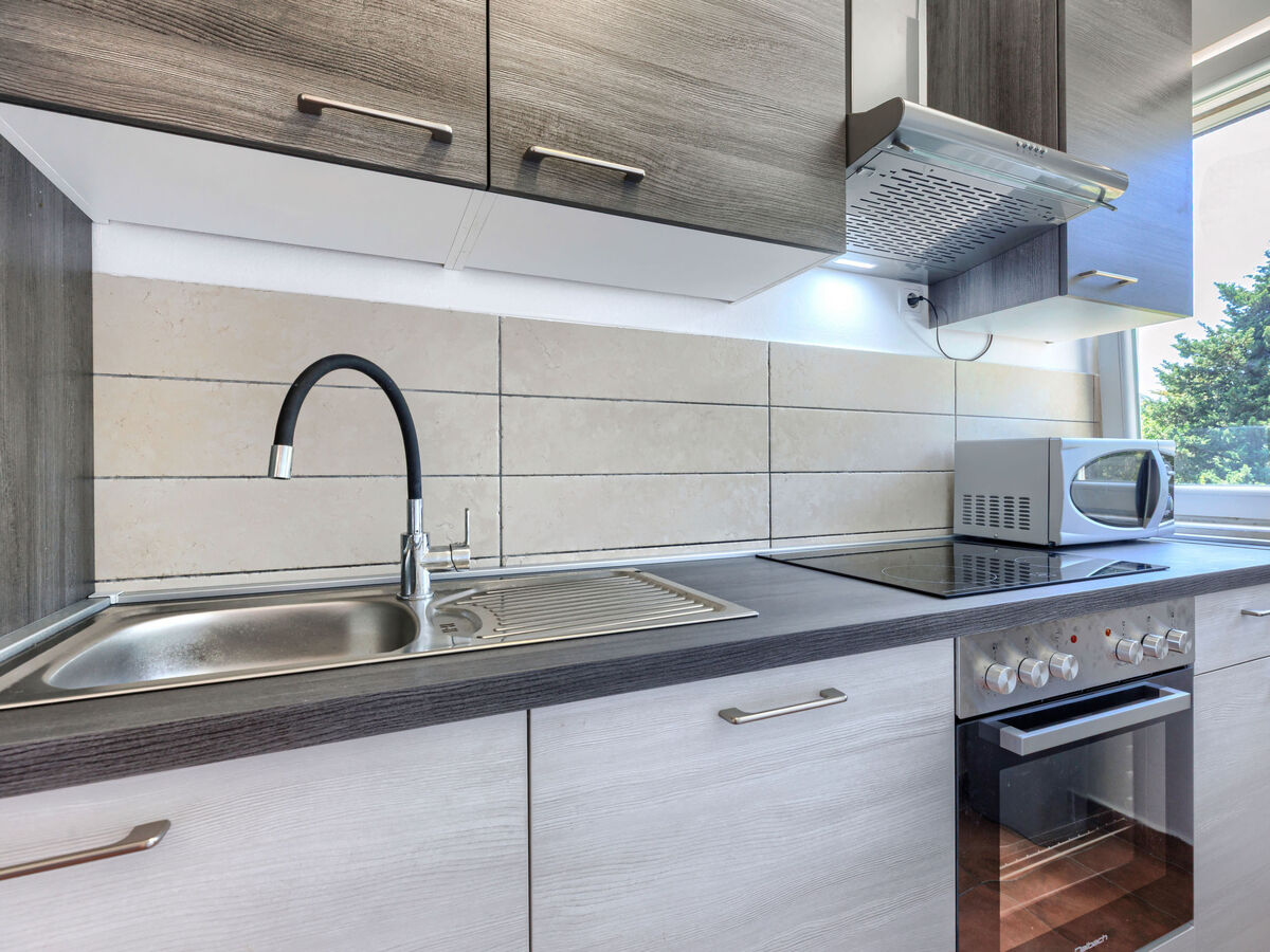 Cuisine ouverte (four, lave-vaisselle, 4 plaques à induction, grille-pain, bouilloire électrique, micro-ondes, congélateur, cafetière électrique).