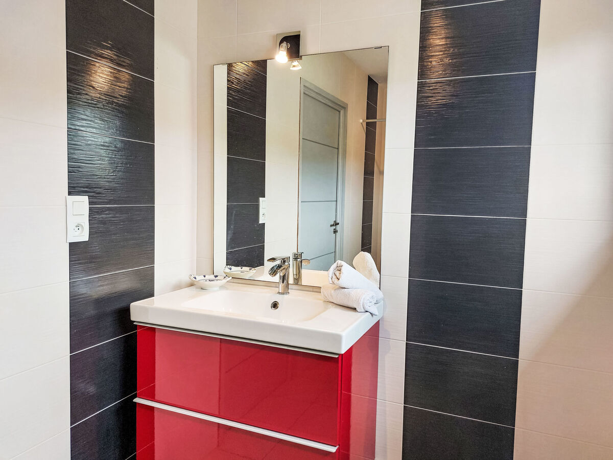 Cuisine ouverte (four, lave-vaisselle, 3 plaques à induction, grille-pain, bouilloire électrique, micro-ondes, congélateur, cafetière électrique) avec bar.