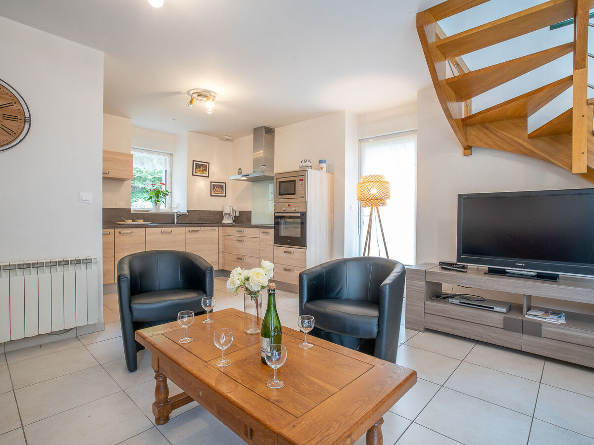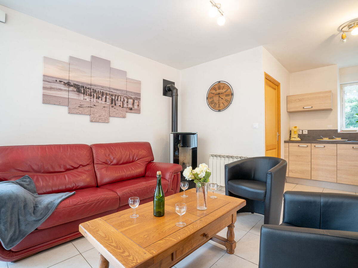 Aménagement agréable et plaisant: séjour/salle à manger avec table pour les repas, TV (satellite), DVD et poêle à bois.