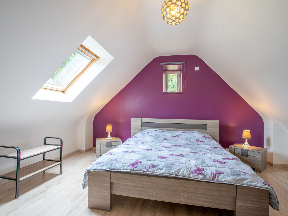 À l'étage supérieur: 1 chambre, mansardée avec 1 grand-lit (160 cm, longueur 200 cm).