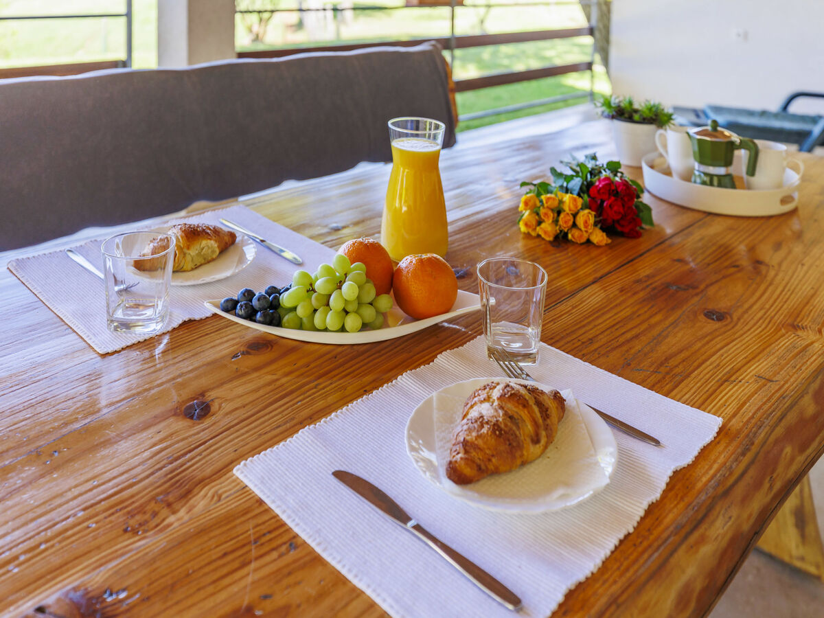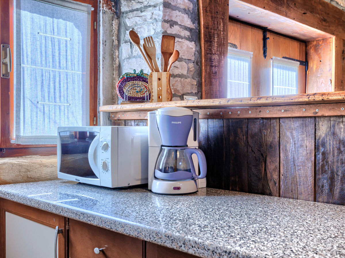 Cuisine (1 plaque de cuisson, 3 feux, grille-pain, bouilloire électrique, micro-ondes, congélateur, cafetière électrique) avec cheminée (uniquement à titre de décoration), table pour les repas.