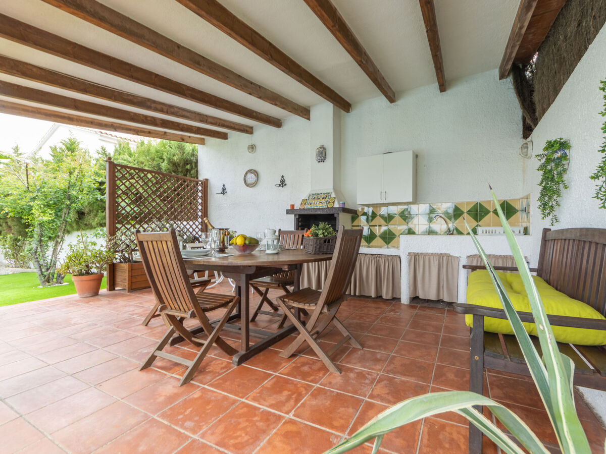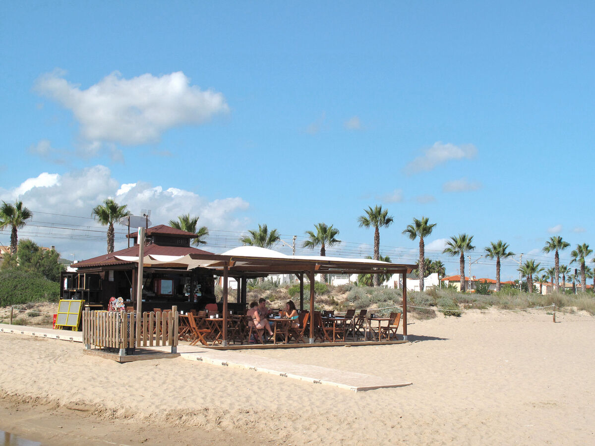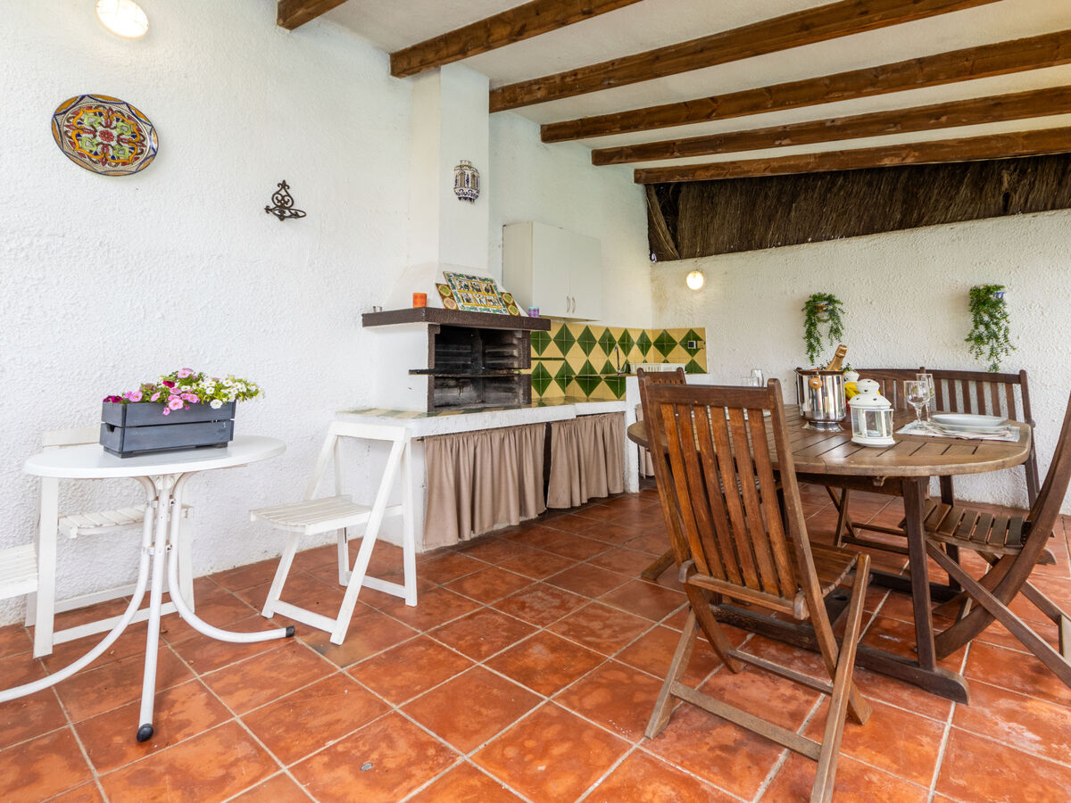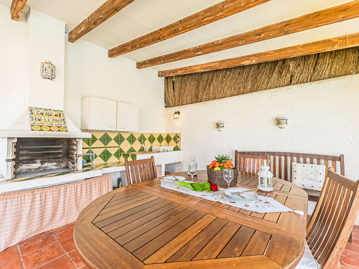 À l’extérieur, on peut profiter d’une terrasse couverte de 4 m² et meublée. Le terrain sur lequel est construite cette villa de vacances fait 600 m². Il est complètement gazonné et plusieurs palmiers y poussent. Un pool house est aussi mis à disposition, ainsi qu’un barbecue bâti en dur.