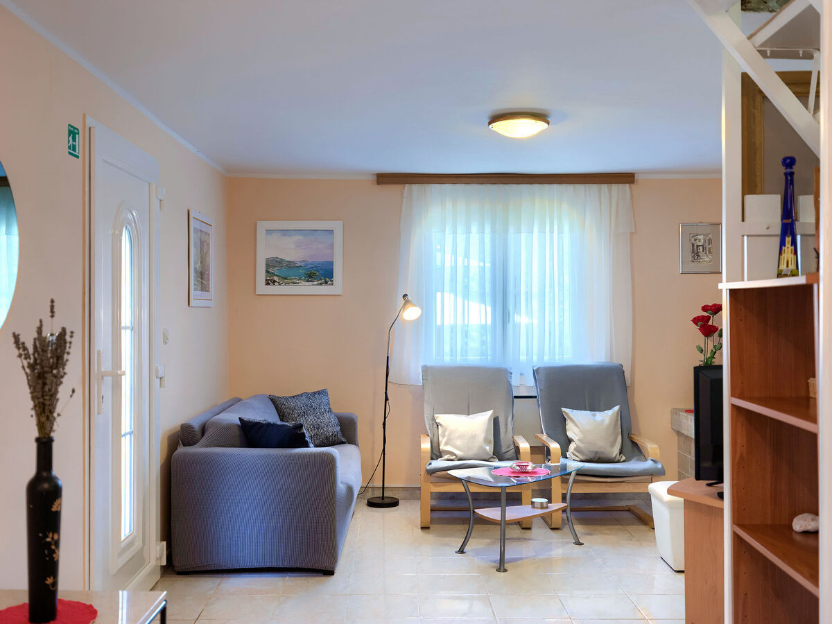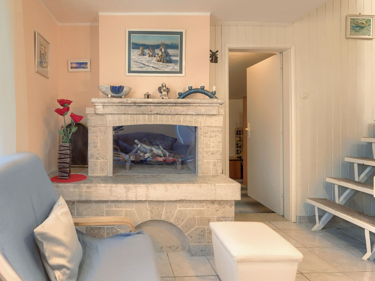 Séjour/salle à manger avec cheminée (uniquement à titre de décoration), TV (satellite) (écran plat), DVD.