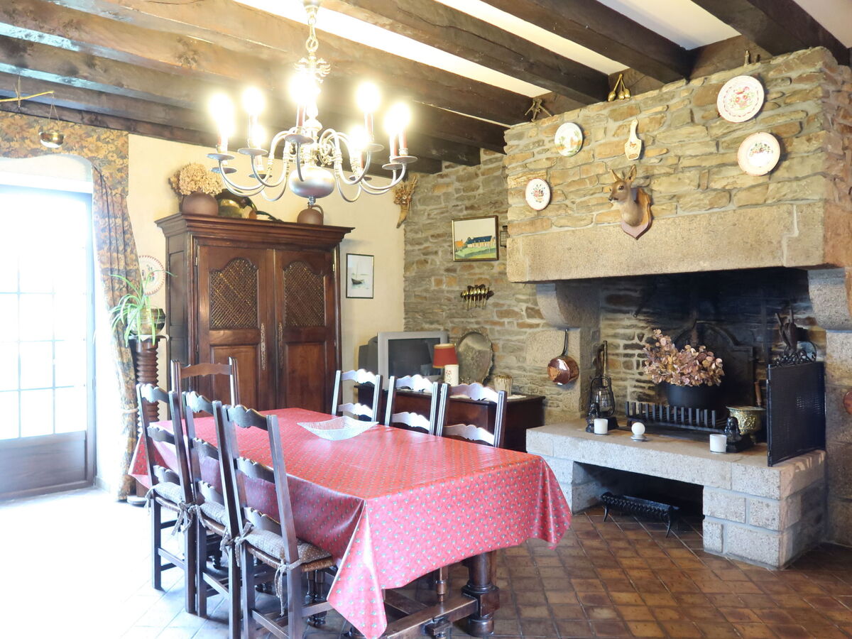 Aménagement rustique et à l'ancienne: séjour/salle à manger avec cheminée (uniquement à titre de décoration), table pour les repas et TV (satellite) (écran plat).