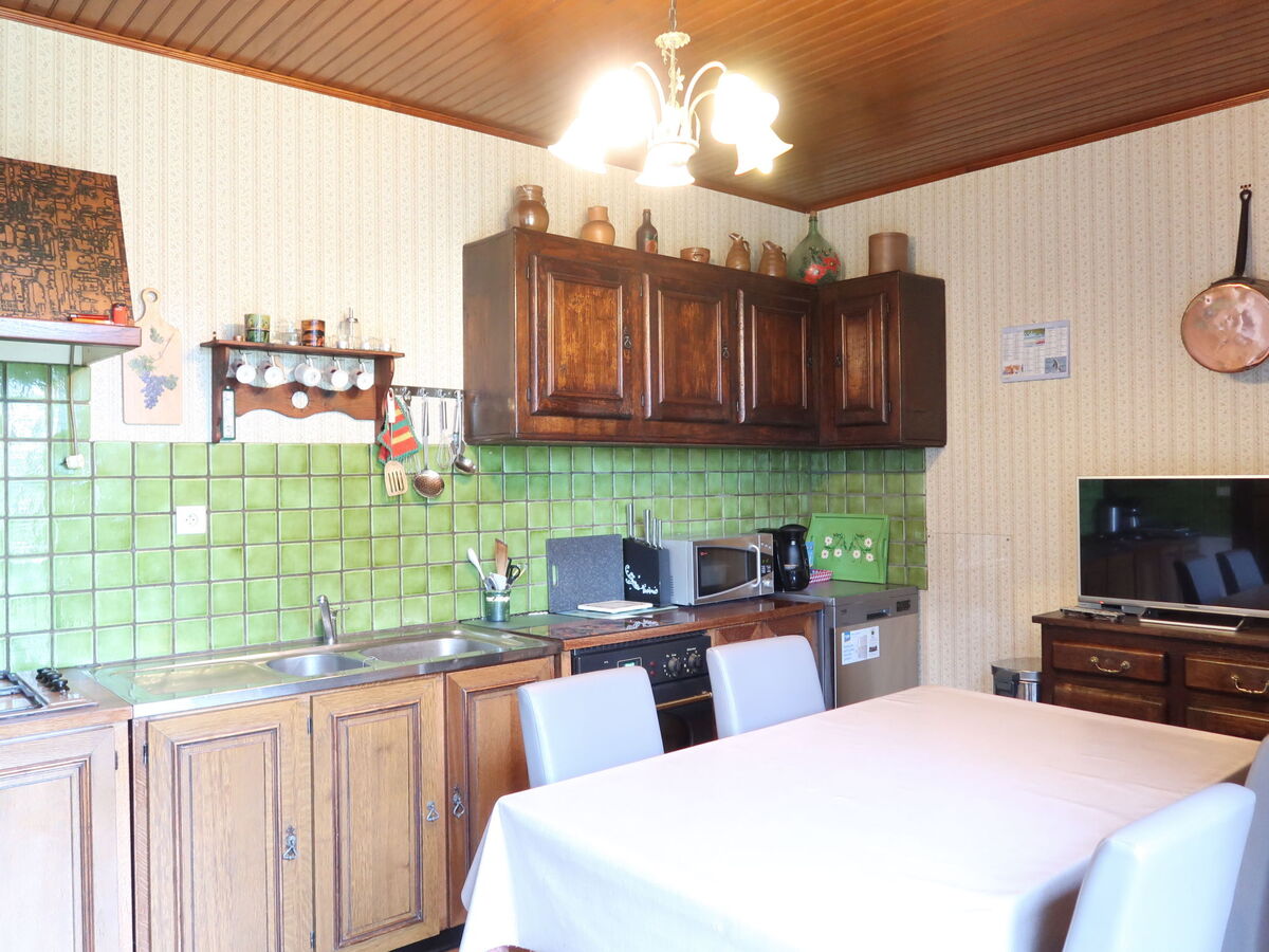 Cuisine (four, lave-vaisselle, Poêle à gaz, 4 feux, grille-pain, bouilloire électrique, micro-ondes, congélateur, gril, cafetière électrique) avec table pour les repas.