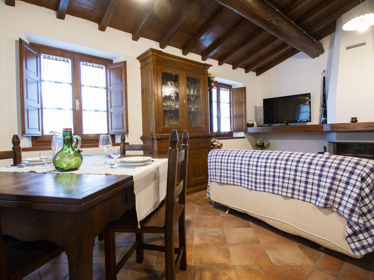 Aménagement rustique: séjour/chambre à coucher avec 1 divan-lit double, cheminée, table pour les repas, TV (satellite) et chaînes de TV internationales.