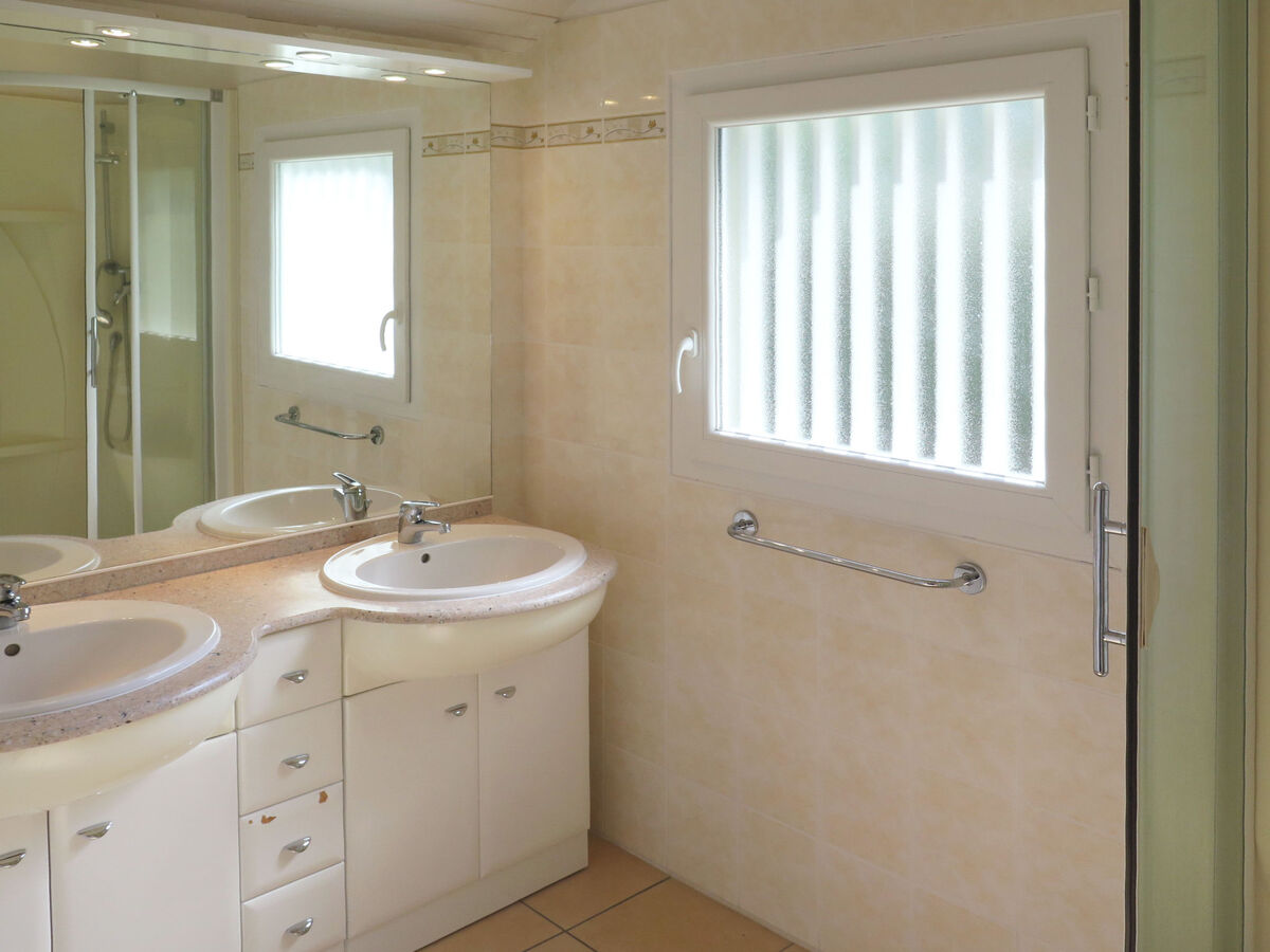 1 chambre avec 1 grand-lit (160 cm, longueur 200 cm), salle de bains et double vasque.