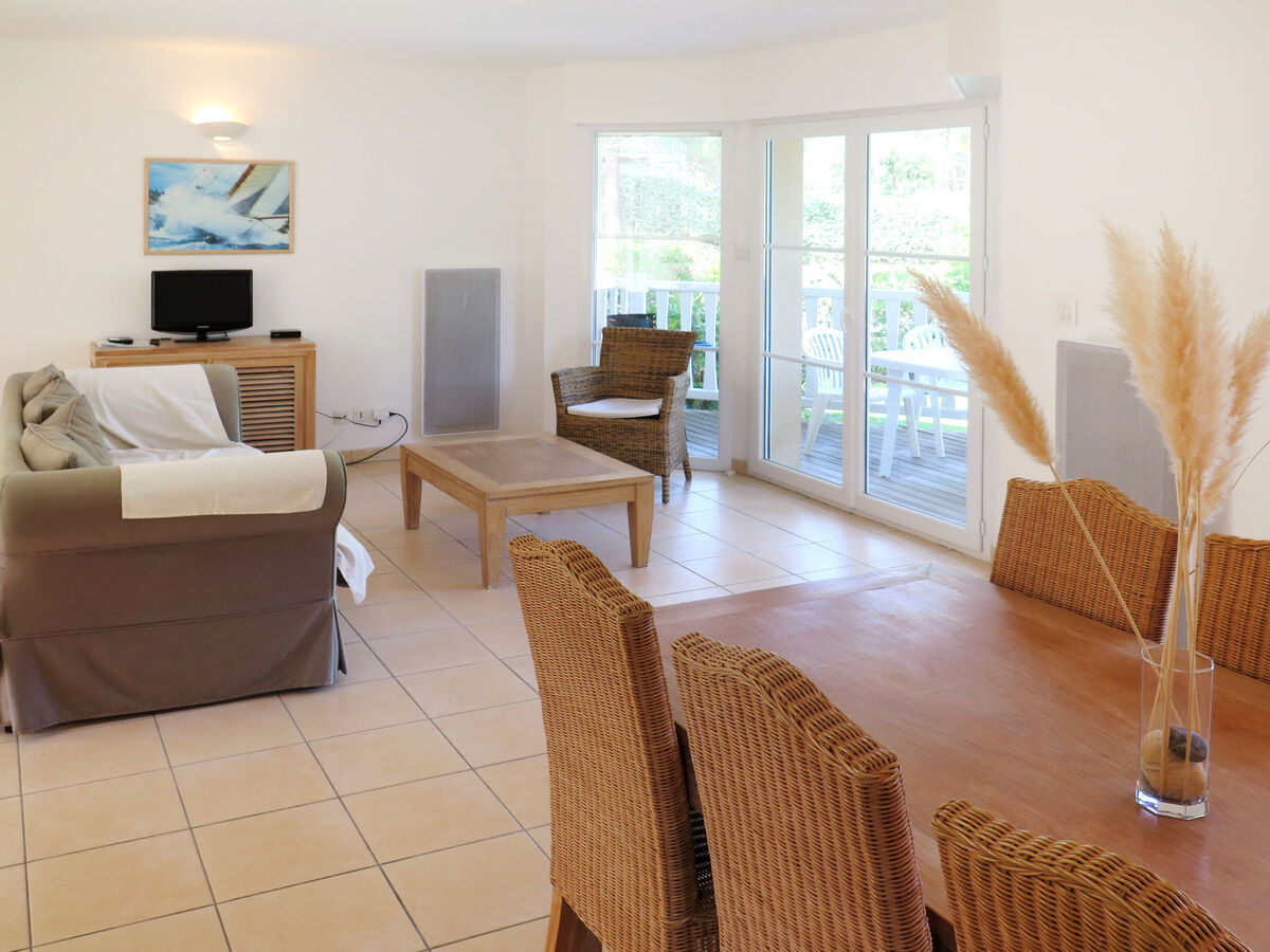 Clair, aménagement confortable et de bon goût: séjour/salle à manger avec table pour les repas et TV (satellite).