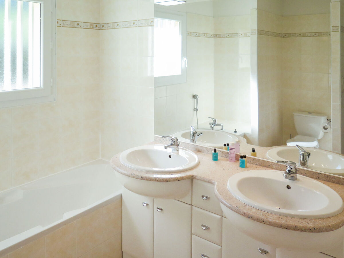 1 chambre avec 1 grand-lit (160 cm, longueur 200 cm), bain/WC et double vasque.