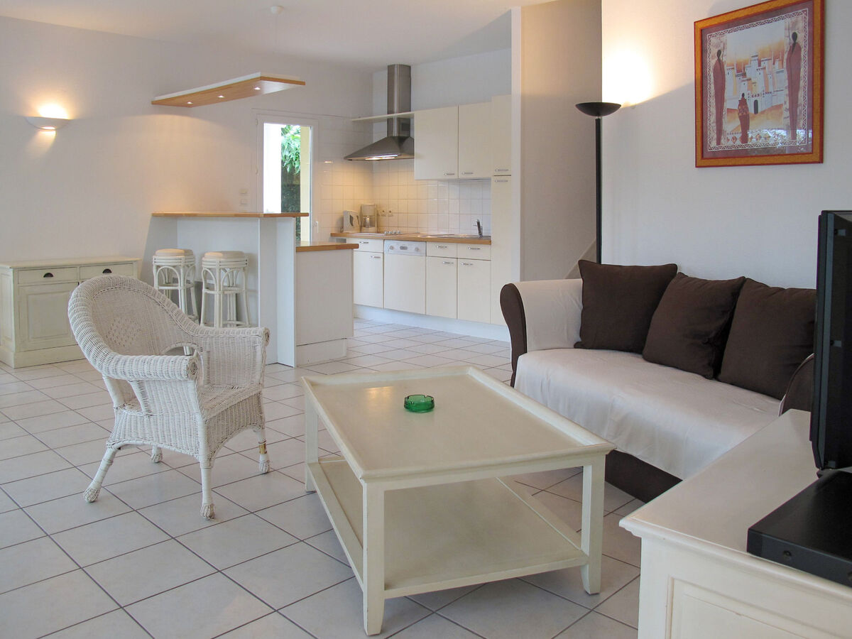 Aménagement agréable: séjour/salle à manger avec baie vitrée avec table pour les repas et TV (satellite) (écran plat).