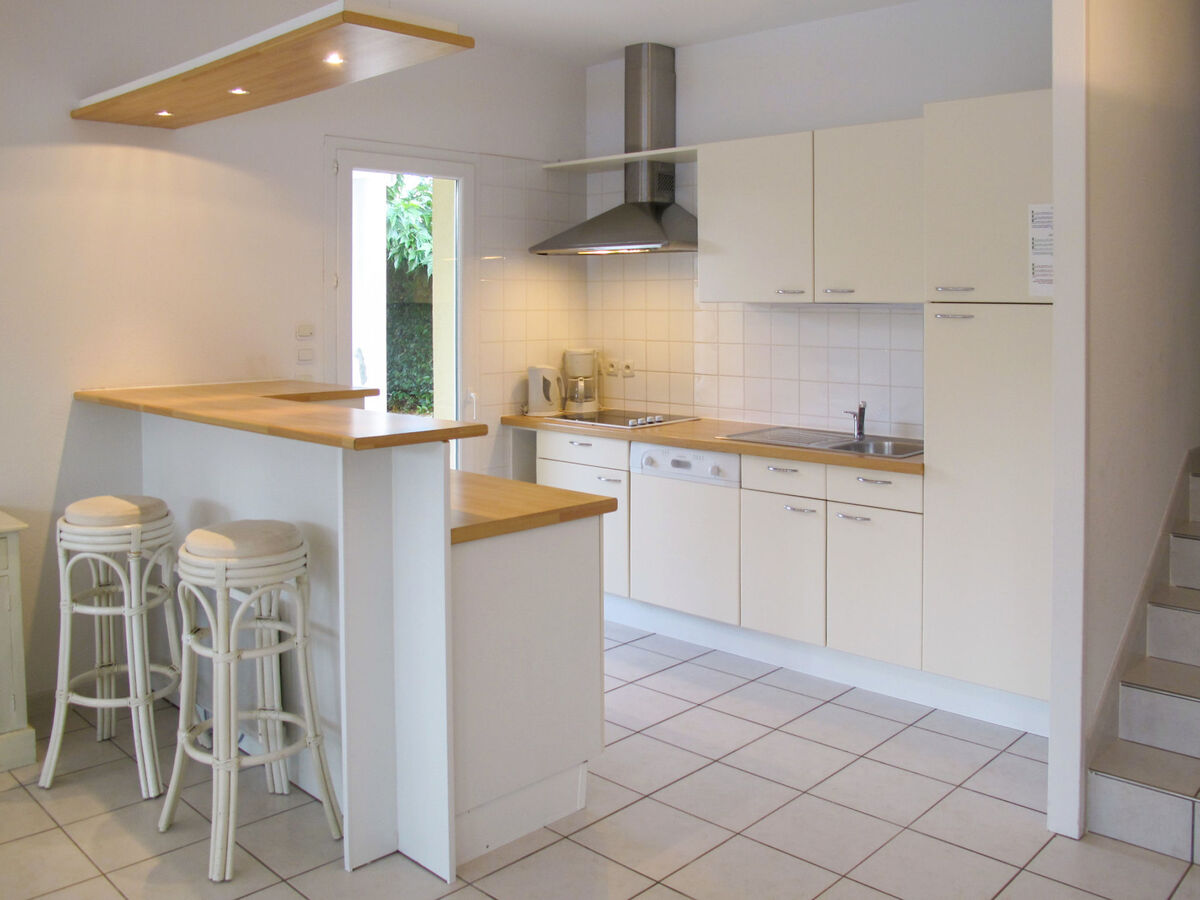 Cuisine ouverte (four, lave-vaisselle, 4 plaques vitrocéramiques, grille-pain, bouilloire électrique, micro-ondes, congélateur, cafetière électrique) avec bar.