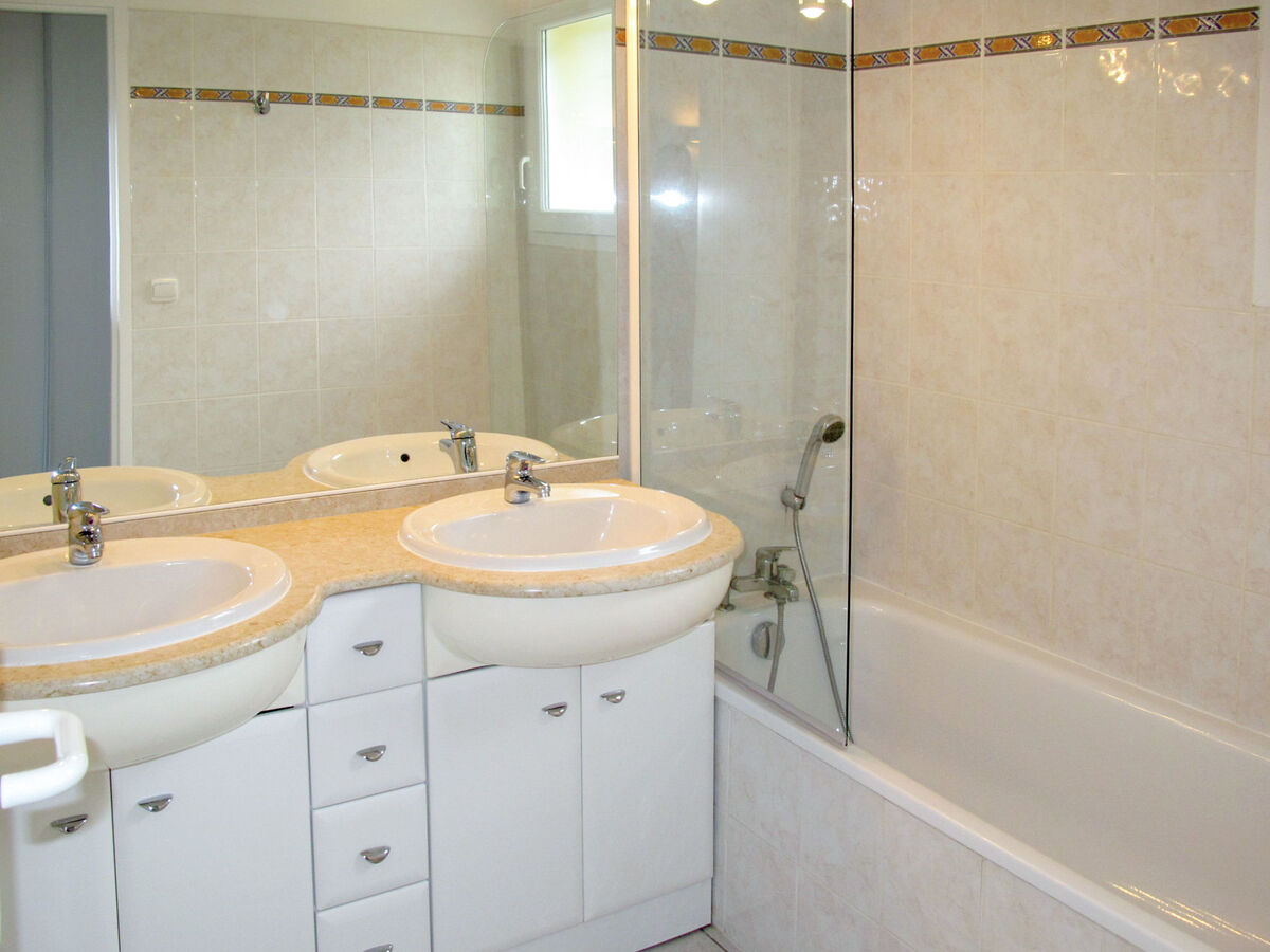 1 chambre avec 1 grand-lit (160 cm, longueur 200 cm), salle de bains et double vasque.