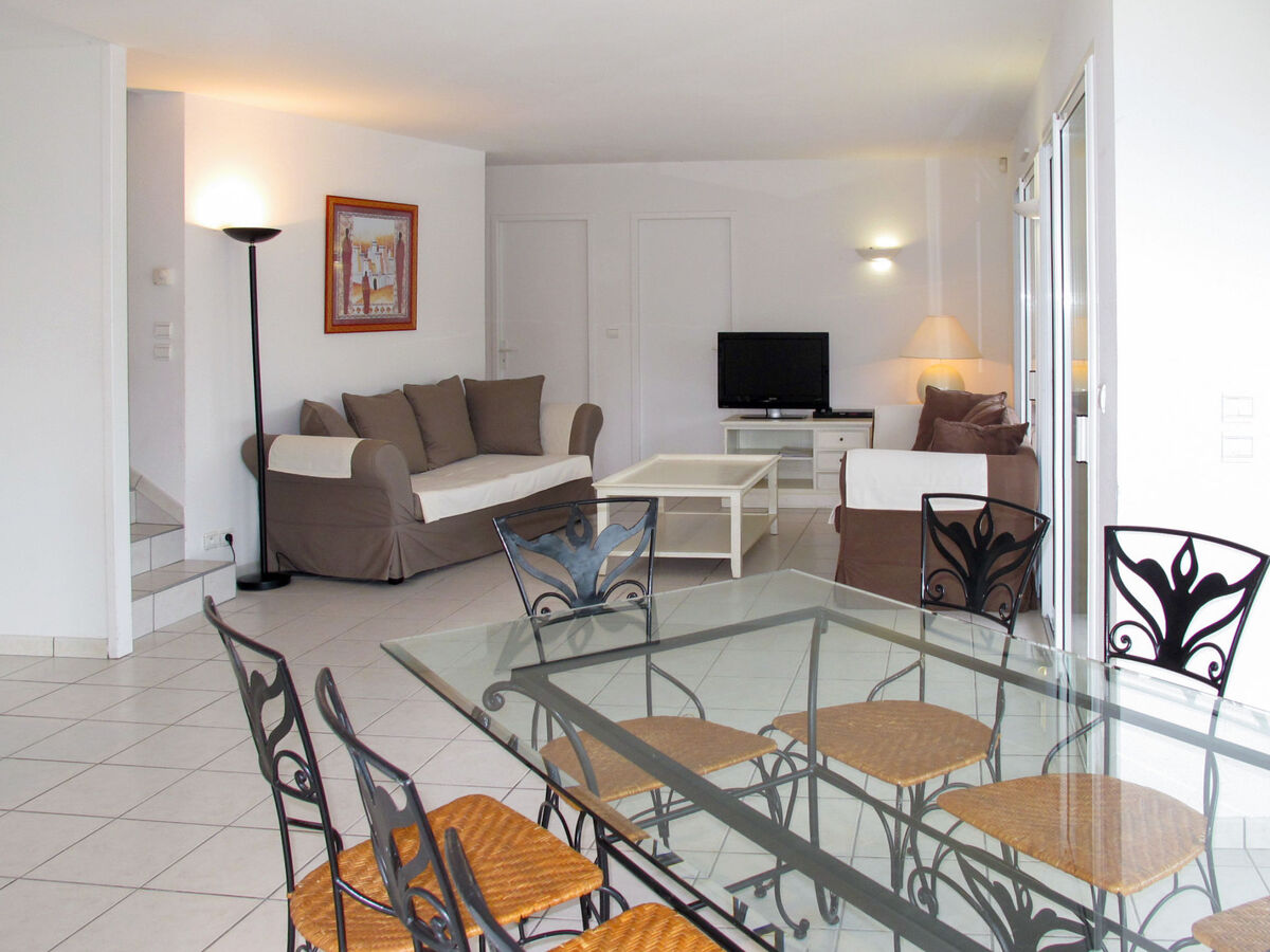 Aménagement agréable: séjour/salle à manger avec baie vitrée avec table pour les repas et TV (satellite) (écran plat).