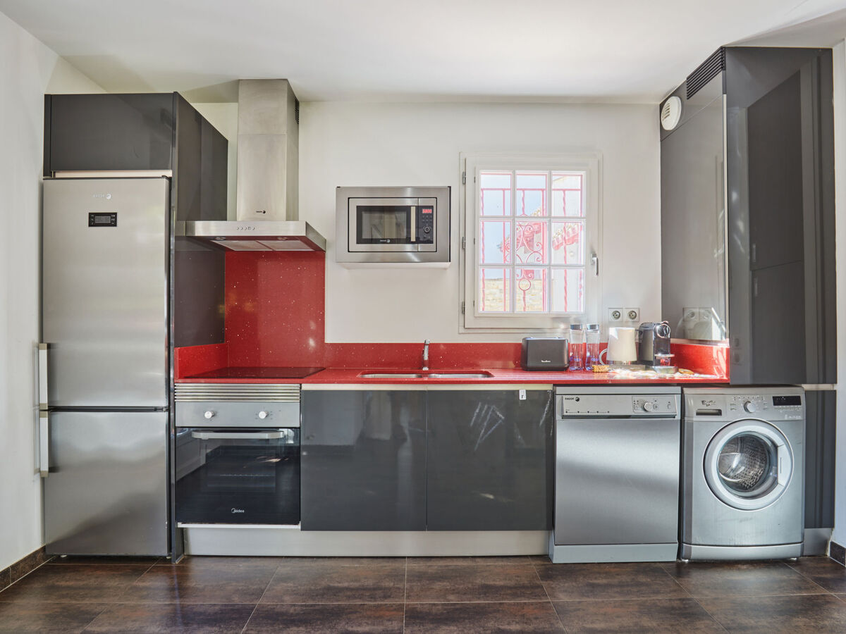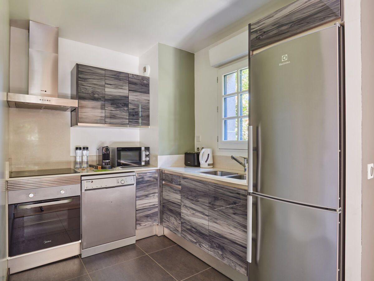 Cuisine ouverte (four, lave-vaisselle, 3 plaques vitrocéramiques, grille-pain, bouilloire électrique, micro-ondes, congélateur, cafetière électrique).