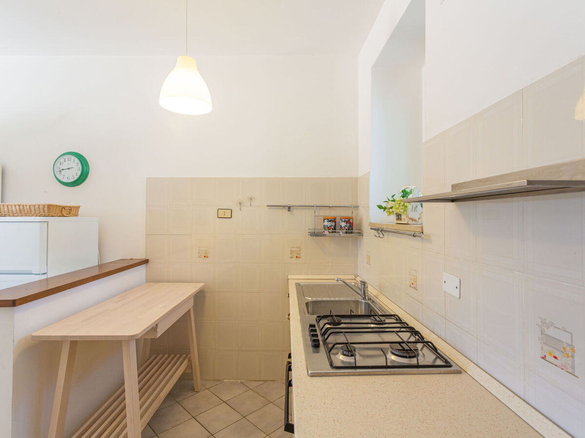 Cuisine (4 plaques de cuisson, four, lave-vaisselle, congélateur) avec table pour les repas.