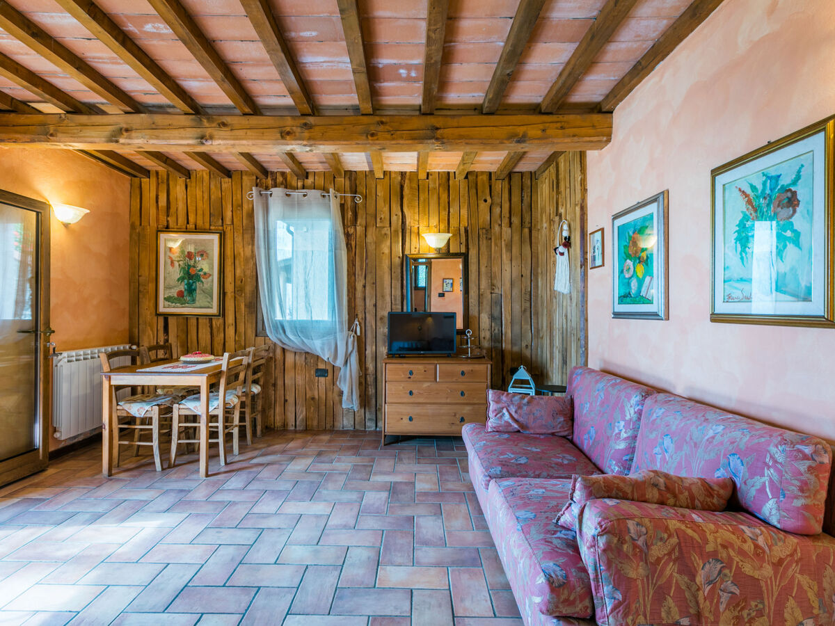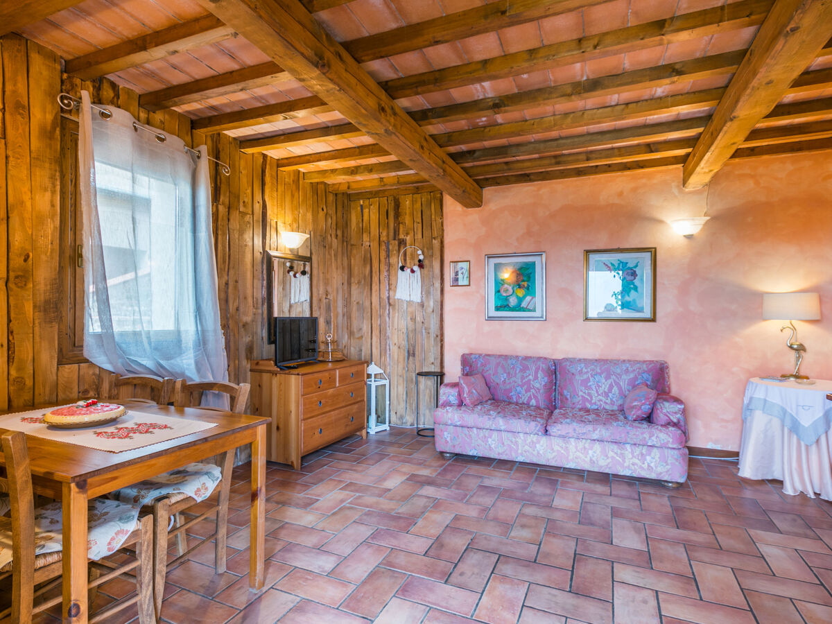 Aménagement agréable et rustique: séjour/chambre à coucher avec 1 divan-lit double (120 cm, longueur 170 cm), table pour les repas et TV (satellite).