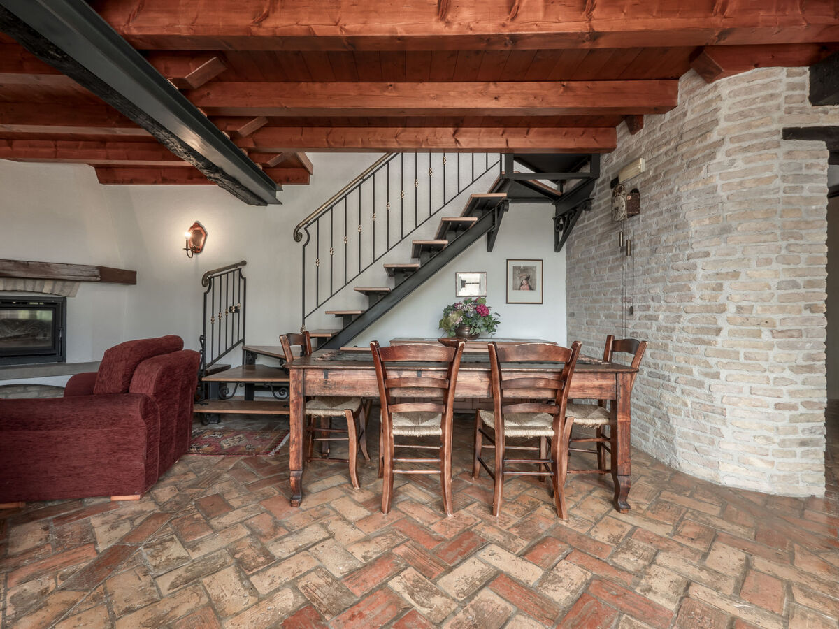 Spacieux, rénovée, aménagement confortable et de bon goût: séjour/salle à manger avec cheminée, table pour les repas et TV (satellite).