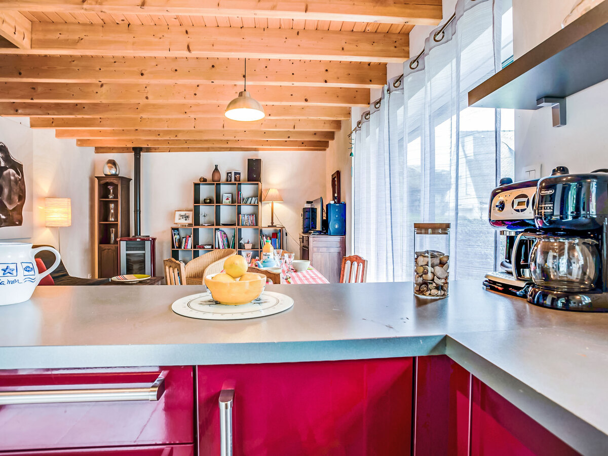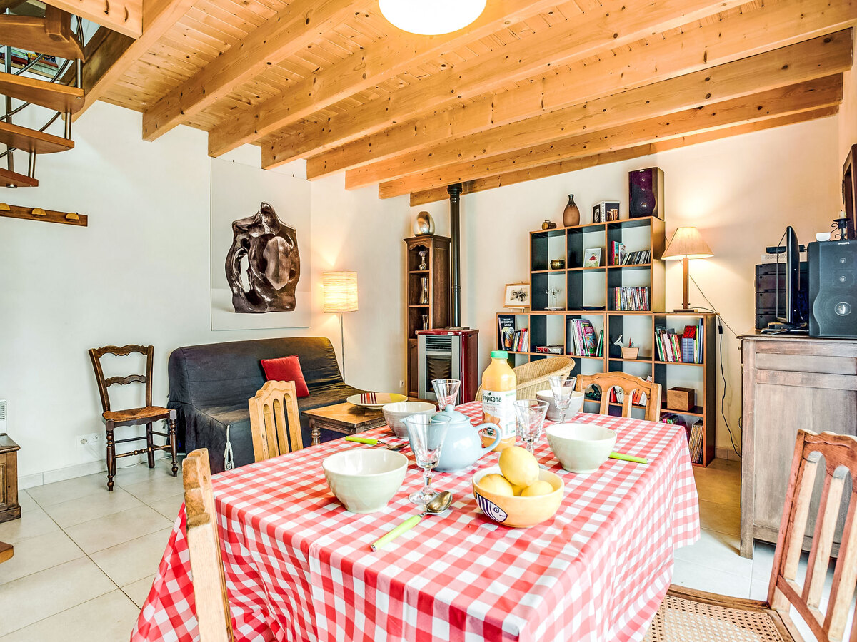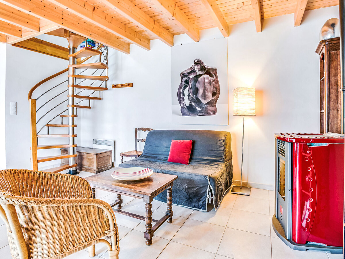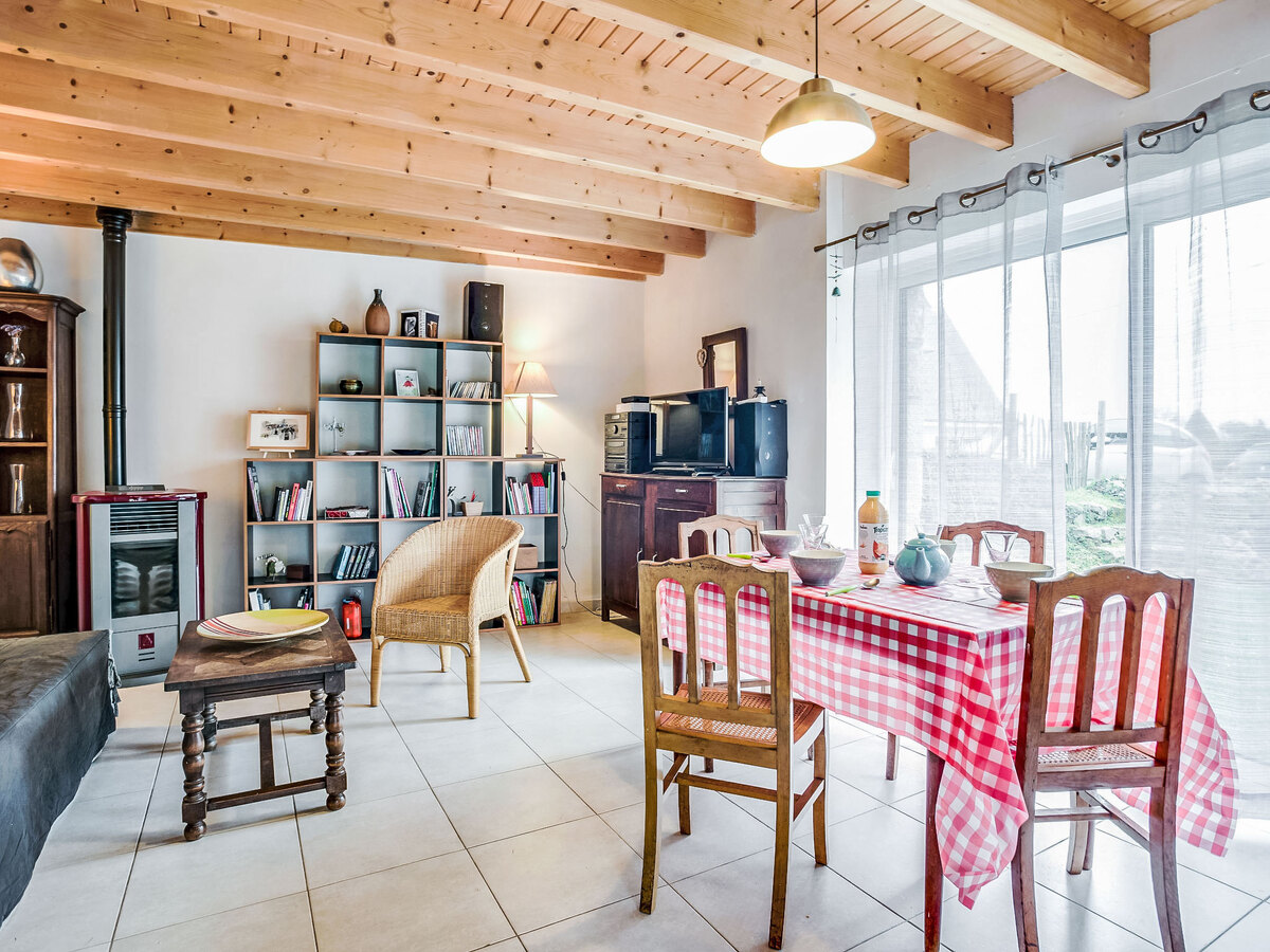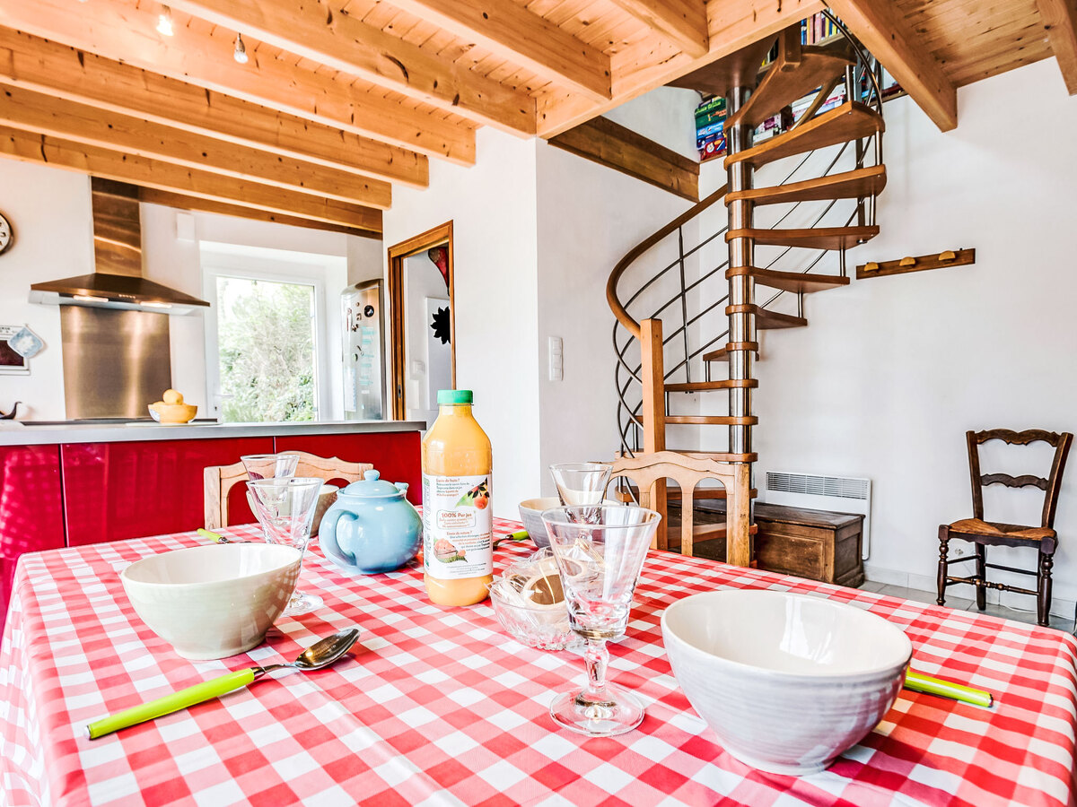 Construite sur deux étages, elle présente un séjour et une salle à manger avec un divan-lit, une chaîne stéréo et un poêle à bois. Quant à la cuisine, elle est équipée de 3 plaques de cuisson, un lave-vaisselle, un congélateur et un micro-ondes. A l'étage supérieur, la chambre avec son lit double (140 cm), sa télévision et son lecteur DVD est accessible par un escalier en colimaçon. La maison présente également une chambre d'enfants, mansardée avec un lit gigogne pour deux personnes. Vous disposez aussi d'une douche/WC.