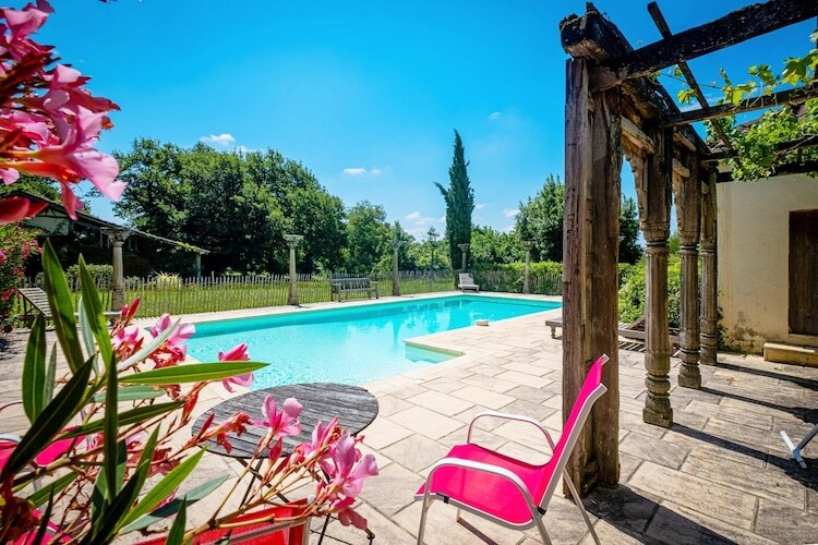 La piscine privée est entourée d'une terrasse ensoleillée jouxtant une terrasse couverte. Il y a un escalier romain où les enfants pourront jouer, tandis que les chaises longues n'attendent plus que vous. Le terrain est plat et comprend de vastes pelouses.
