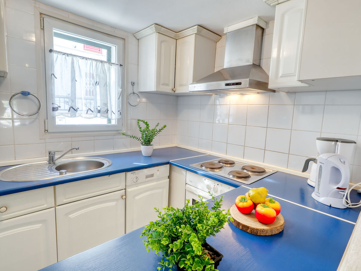 Cuisine ouverte (4 plaques de cuisson, four, lave-vaisselle, grille-pain, bouilloire électrique, cafetière électrique, Capsules pour machine à café (Dolce Gusto)).
