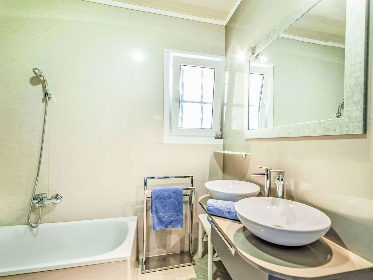 À l'étage inférieur: 1 chambre avec 1 lit double (2 x 90 cm, longueur 190 cm), lavabo.