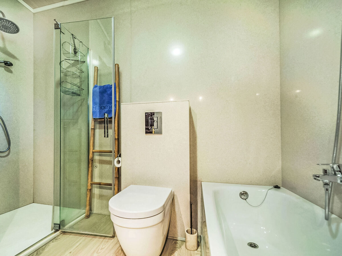 Cuisine ouverte (mini-four, lave-vaisselle, 4 plaques vitrocéramiques, grille-pain, bouilloire électrique, micro-ondes, congélateur, cafetière électrique).