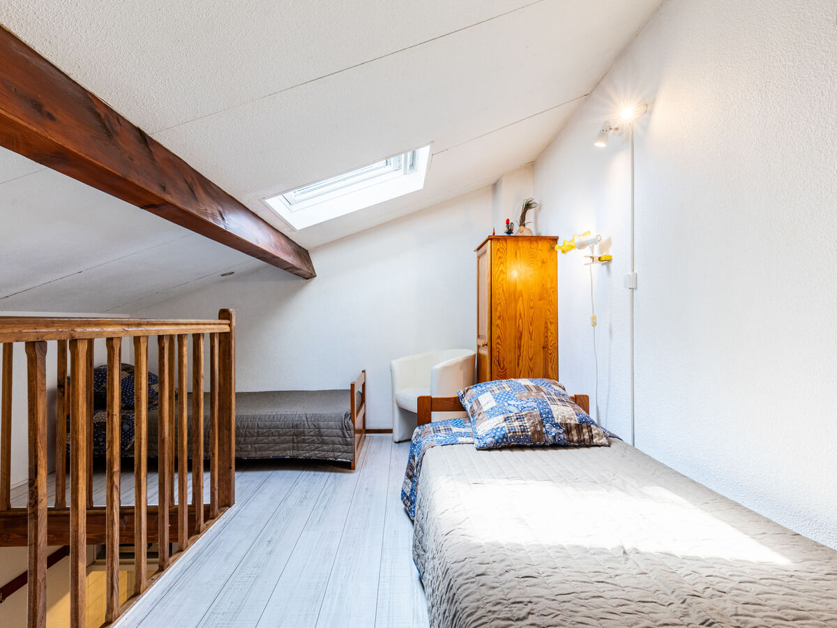 À l'étage supérieur: galerie mansardée, hauteur plafond 110 - 240 cm avec 2 lits (90 cm, longueur 190 cm).