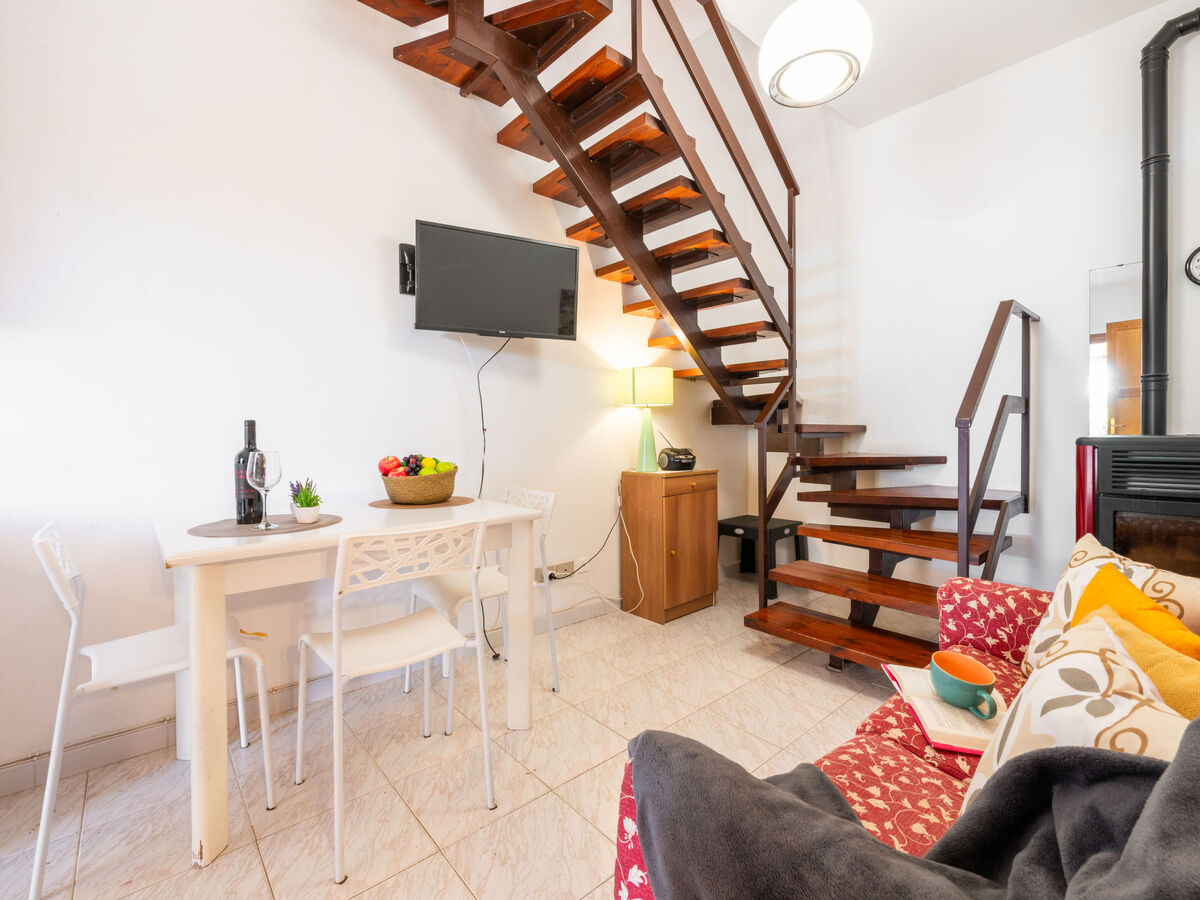 Aménagement simple et fonctionnel: petit séjour/salle à manger avec 1 divan-lit (140 cm, longueur 190 cm), table pour les repas et TV (écran plat).