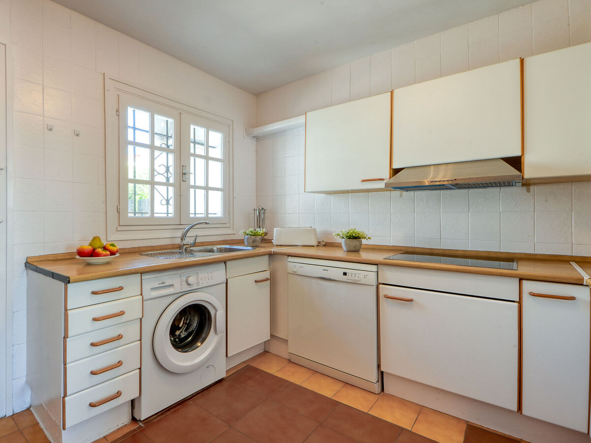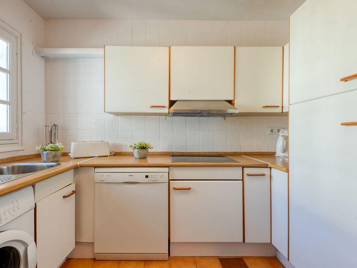 Cuisine (four, lave-vaisselle, 4 plaques vitrocéramiques, grille-pain, bouilloire électrique, micro-ondes, congélateur, cafetière électrique, Capsules pour machine à café (Dolce Gusto)).