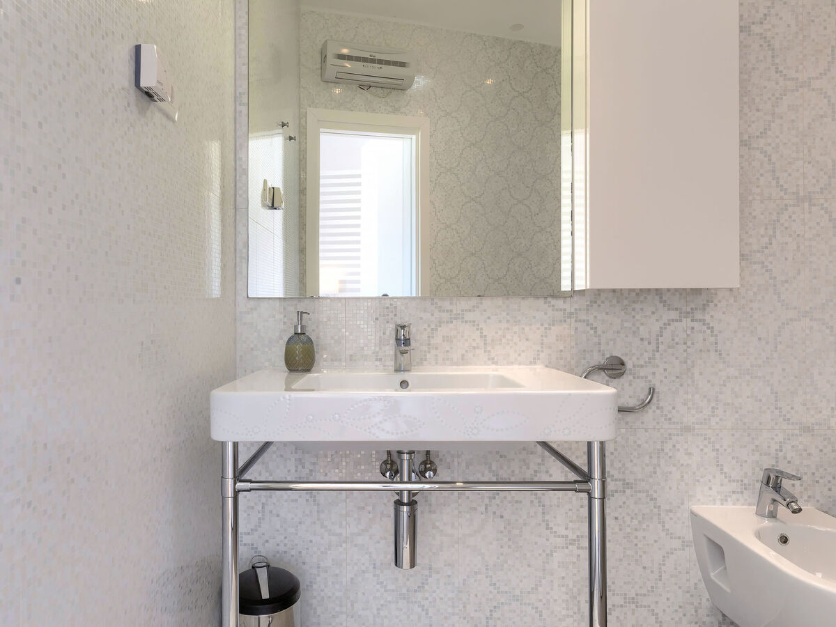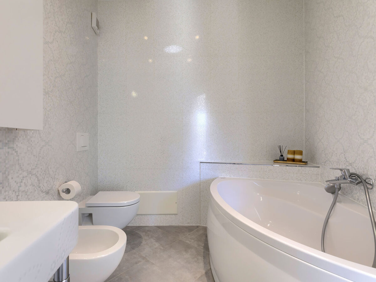 À l'étage supérieur: 1 chambre avec 1 grand-lit (160 cm, longueur 200 cm), bain/bidet/WC, avec baignoire d'angle et air-conditionné.