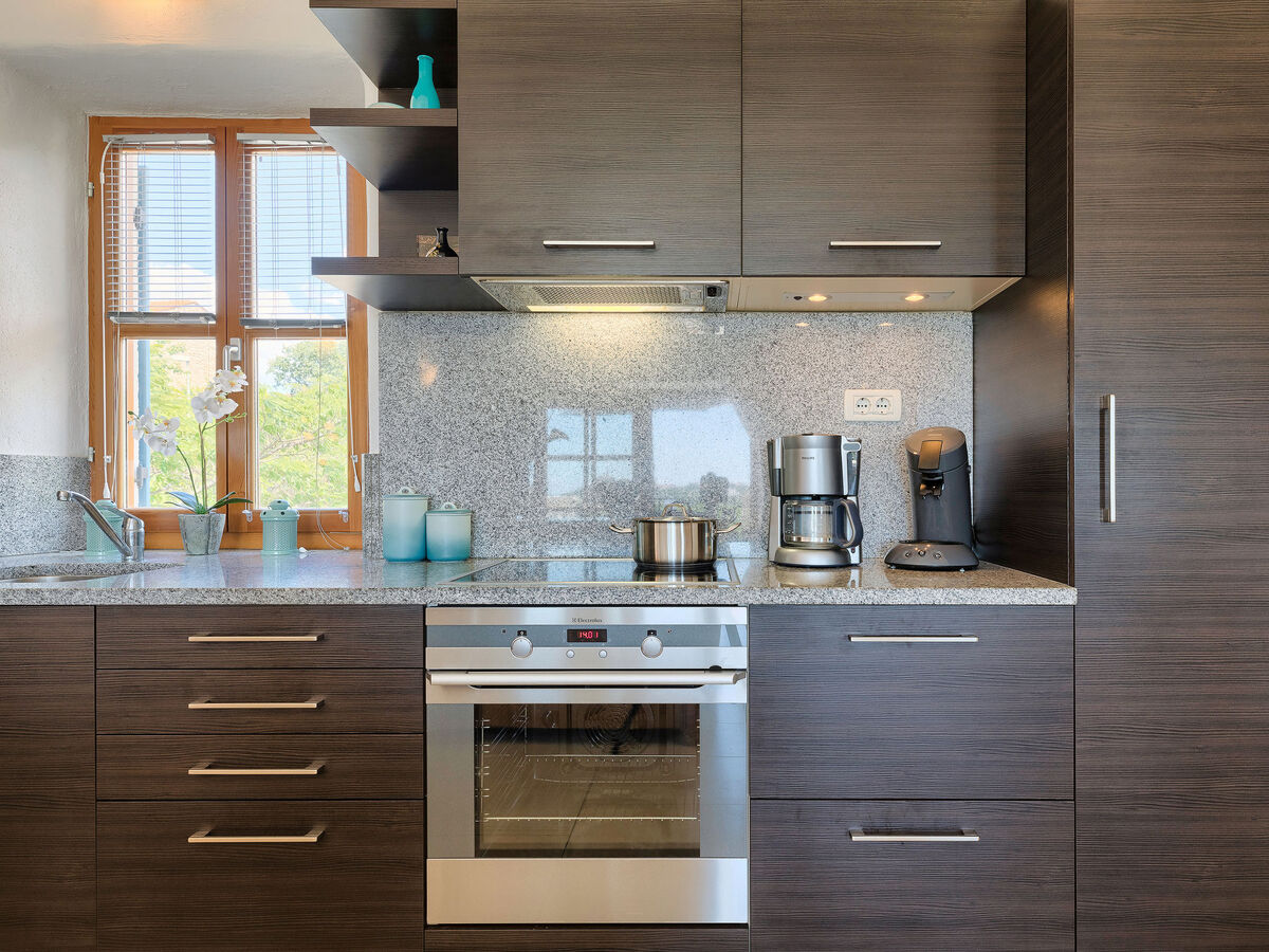 Cuisine ouverte (four, lave-vaisselle, 4 plaques vitrocéramiques, micro-ondes, congélateur).