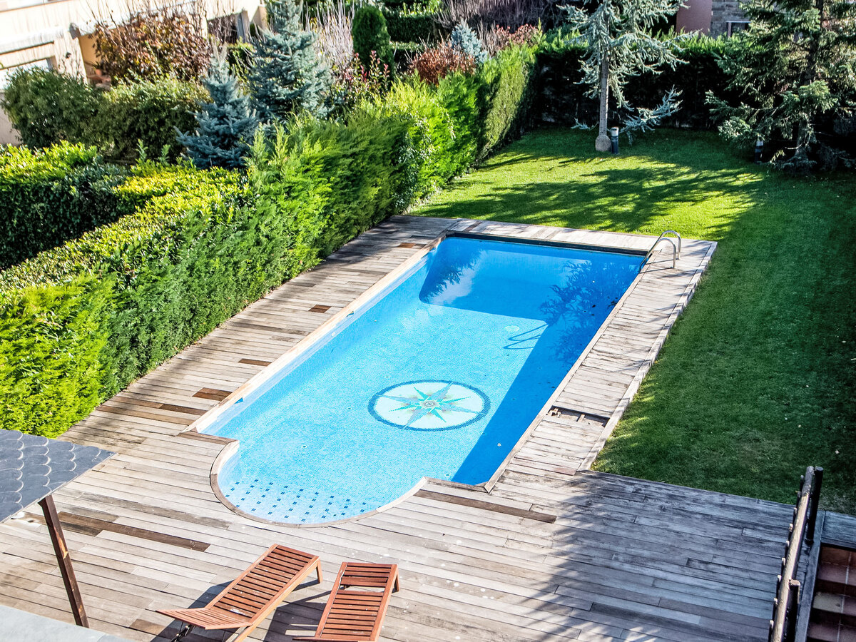 A usage privé: terrain (clôturé), beau jardin 350 m2 avec pelouse, piscine (9 x 5 m, profondeur 100 - 200 cm, disponibilité saisonnière: 30.Jun.