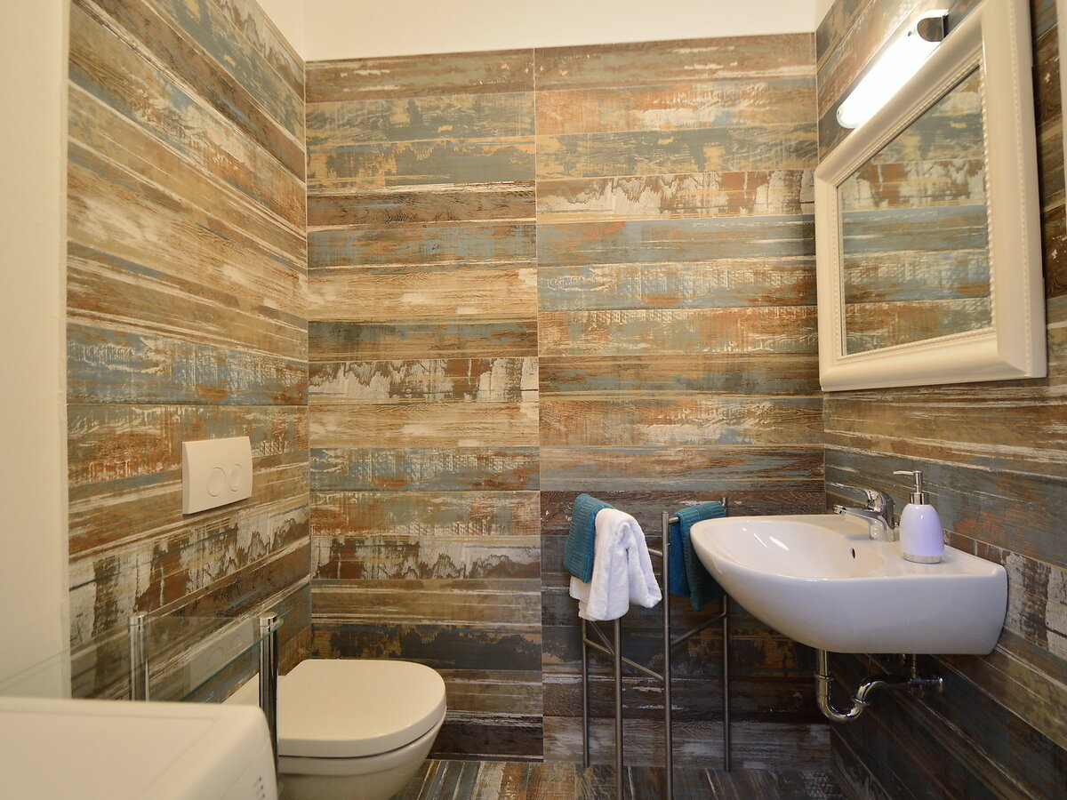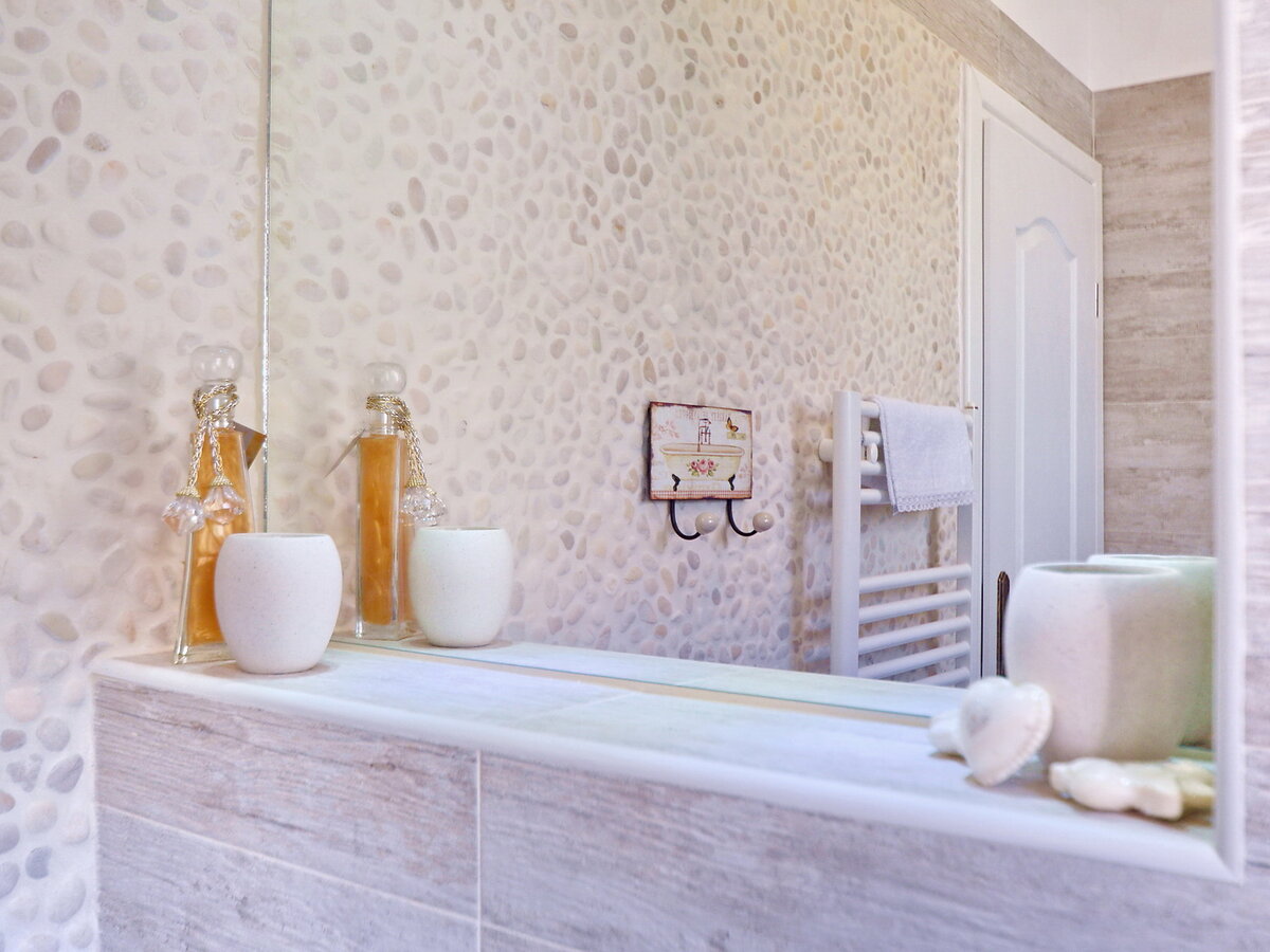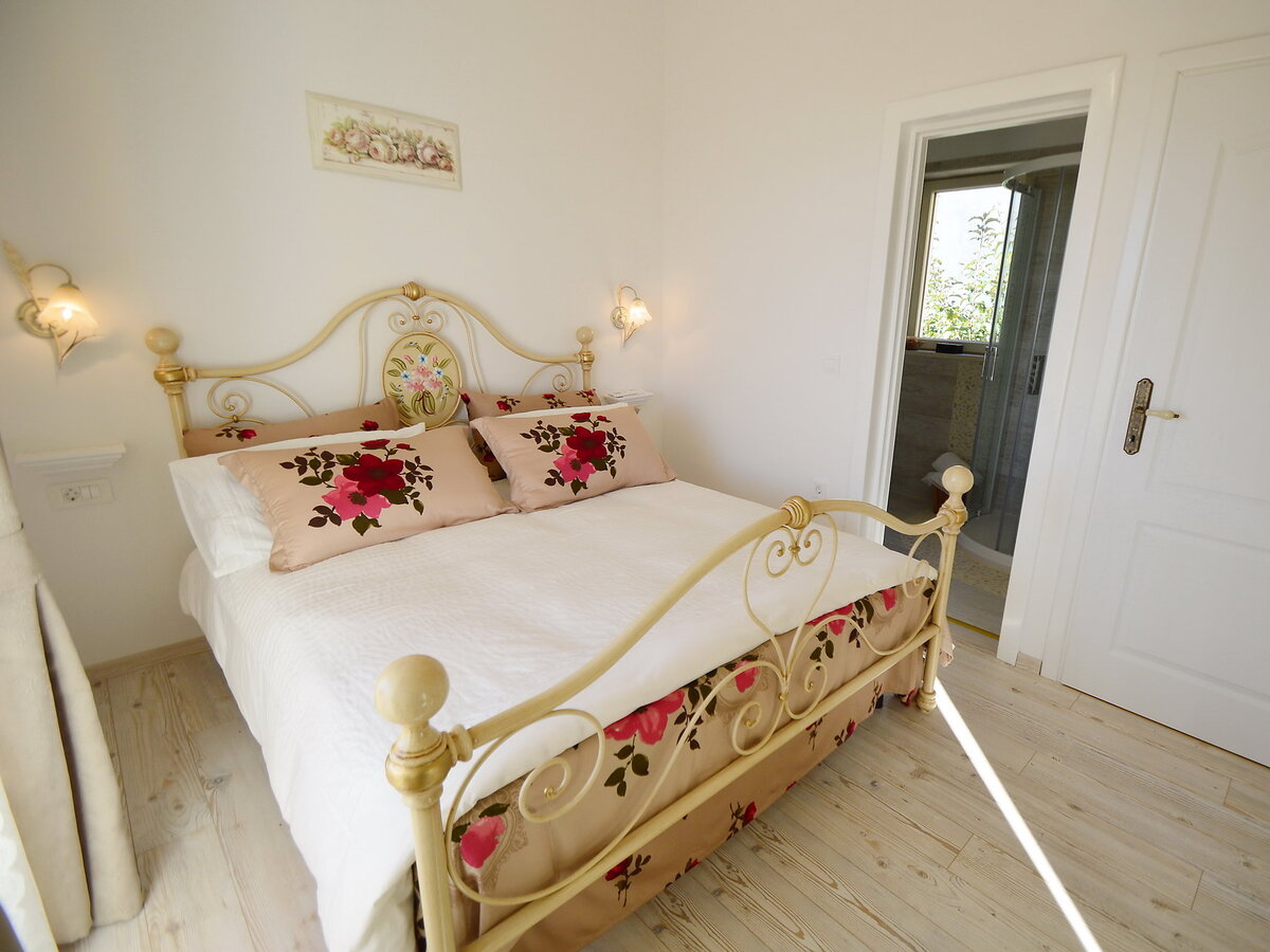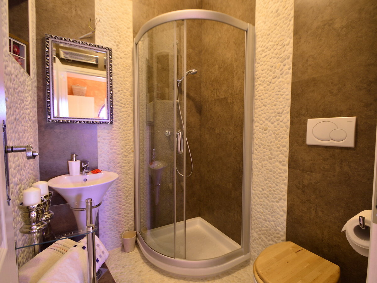 À l'étage supérieur: 1 chambre avec 1 grand-lit (160 cm, longueur 200 cm), douche/WC et air-conditionné.