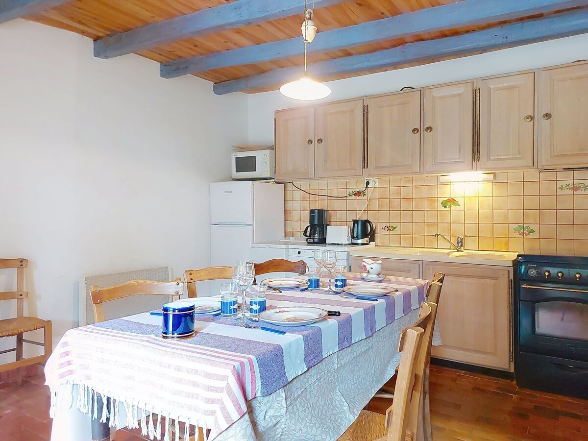 Cuisine (1 plaque de cuisson, four, lave-vaisselle, 3 feux, grille-pain, bouilloire électrique, micro-ondes, congélateur, cafetière électrique) avec table pour les repas.