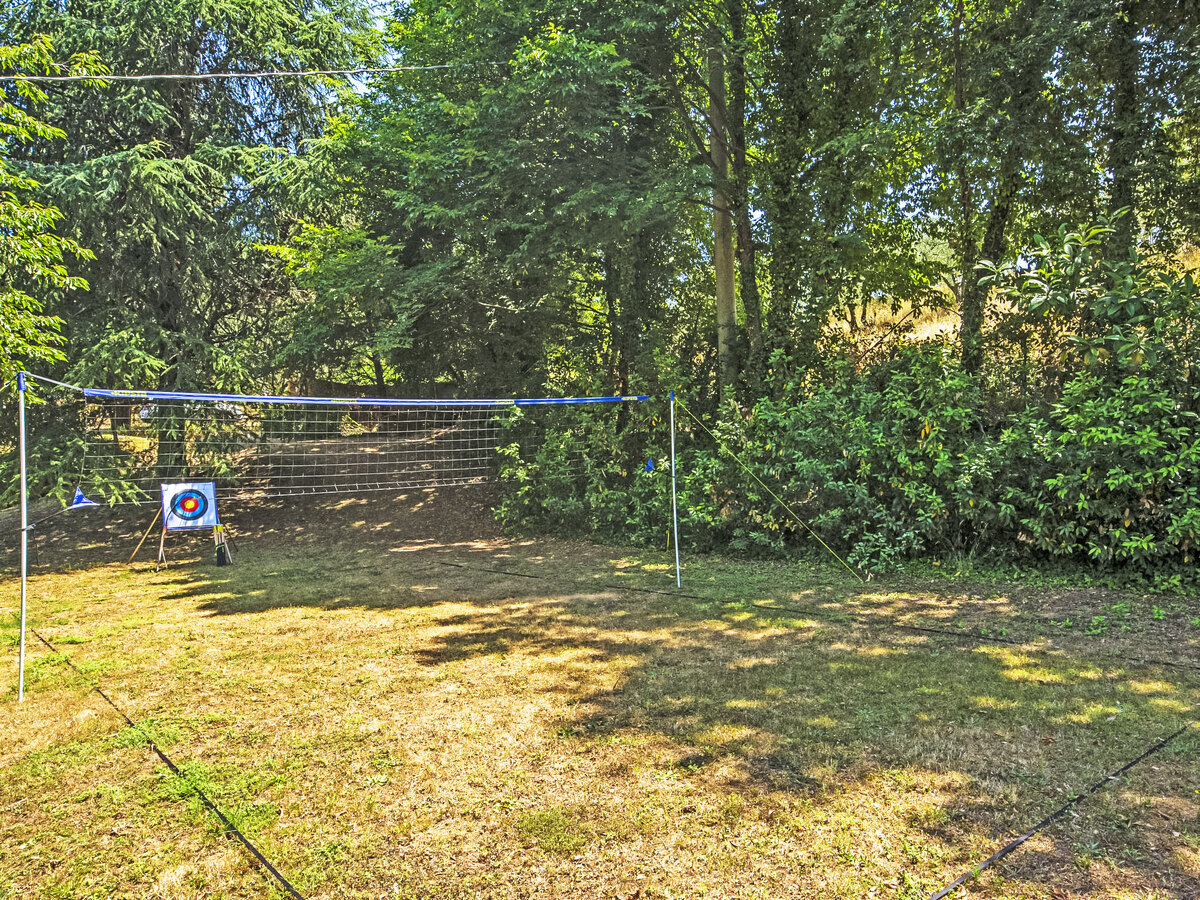 Douche extérieure, terrain de volley-ball, meubles de jardin.