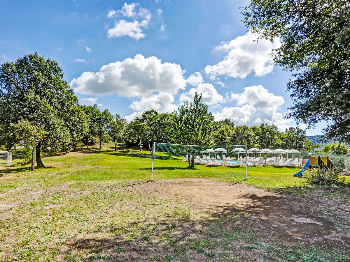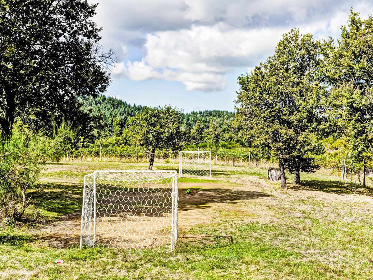 Douche extérieure, terrain de volley-ball, meubles de jardin, espace de jeux pour les enfants (toboggan).