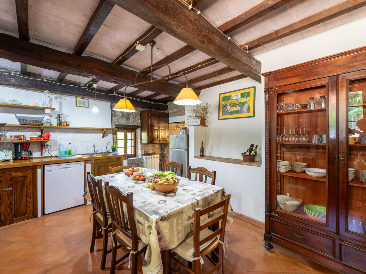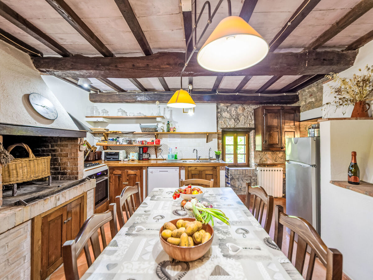 Il y a un grand séjour avec cheminée qui fait également office de salle à manger, il est équipé d’une télévision avec antenne satellite. Puis, vient une cuisine avec cheminée équipée de 4 plaques de cuisson, un four, un four à micro-ondes, un lave-vaisselle et une table pour les repas. Il y a en outre deux sorties à cet étage, une sortie sur le jardinet et une autre sur le jardin.