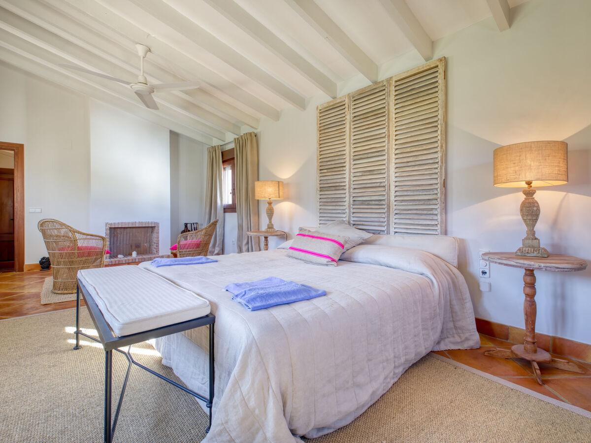 À l'étage supérieur: 1 grande chambre avec 1 grand-lit (200 cm, longueur 200 cm), cheminée, douche/WC, double vasque et TV (écran plat).