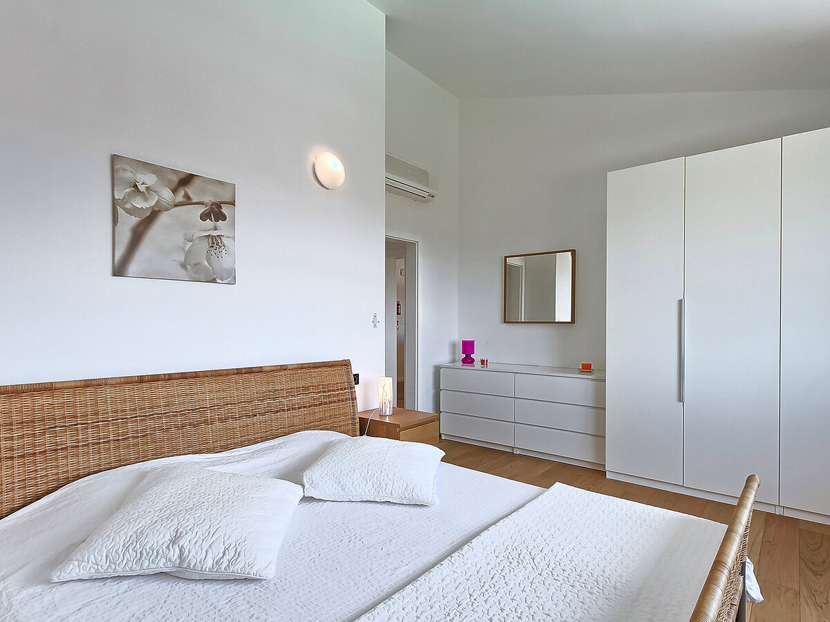 1 chambre avec 1 grand-lit (180 cm, longueur 200 cm), bain/WC et air-conditionné.