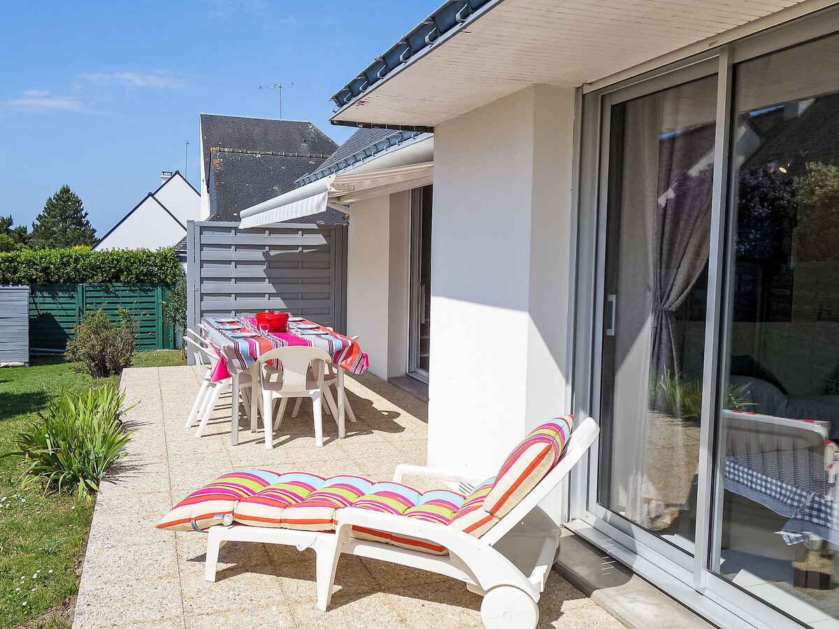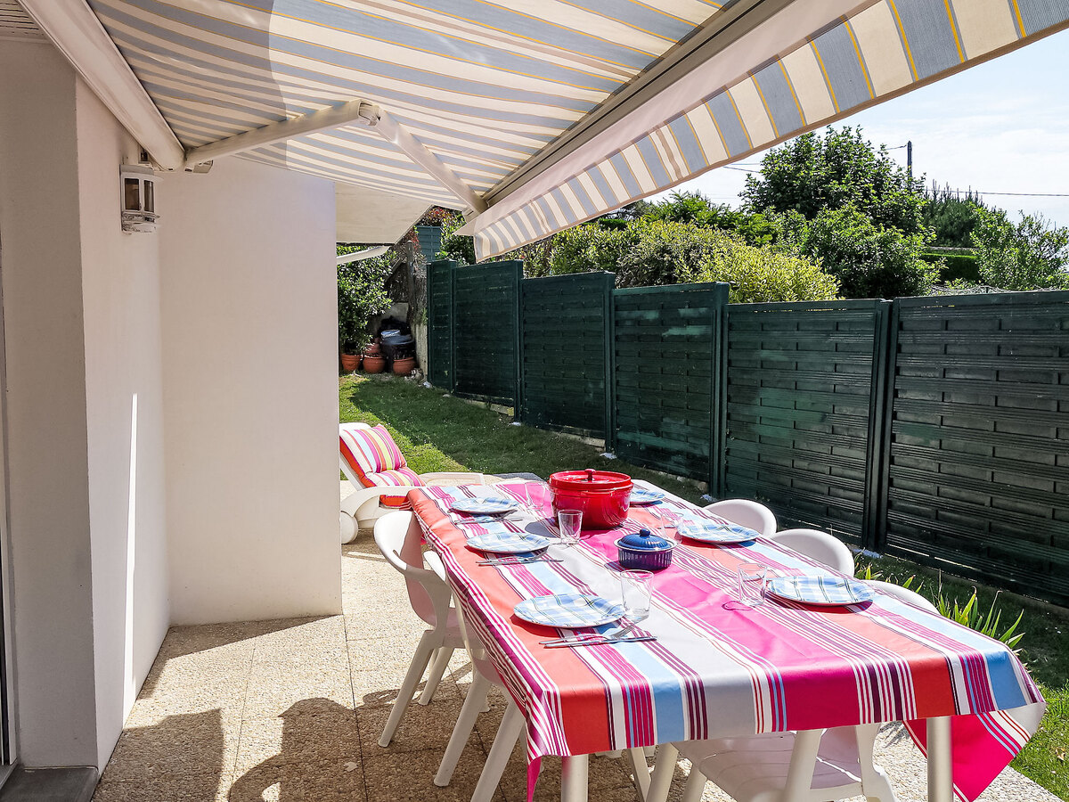 La terrasse est de 22 m² et partiellement couverte. Elle contient des meubles de terrasse et des chaises longues. La maison dispose aussi d'un terrain de 450 m² et d'un jardin de 300 m² avec pelouse.