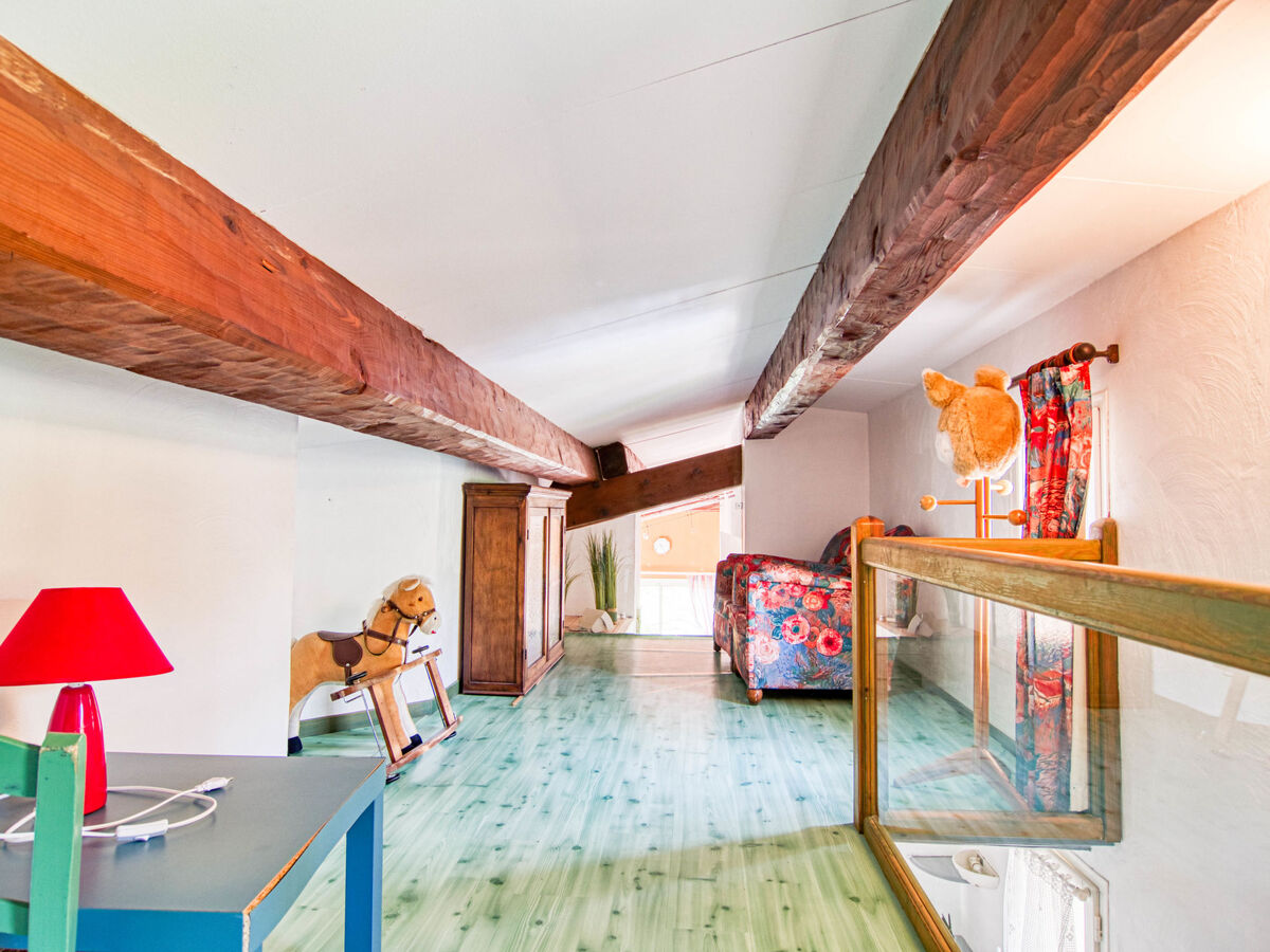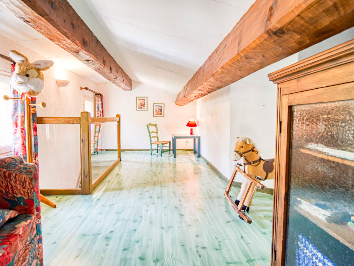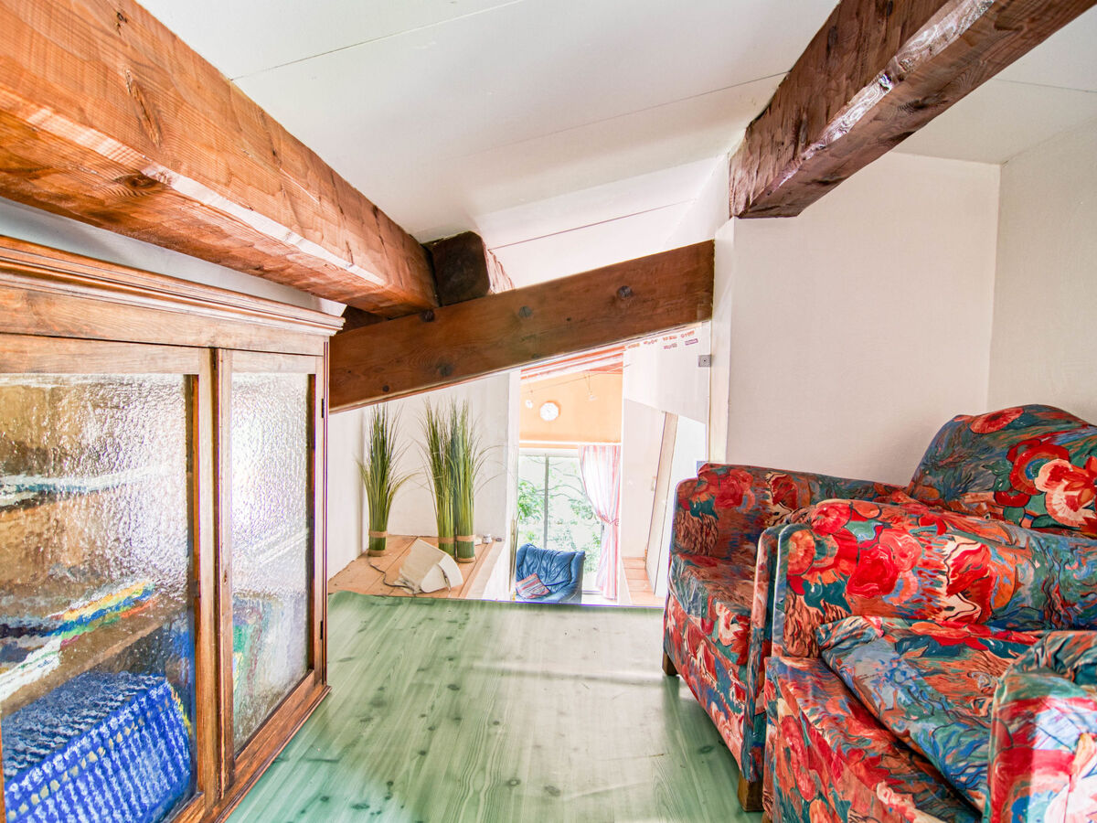 À l'étage supérieur: (escalier en colimaçon) chambre avec passage avec 1 divan-lit double (140 cm, longueur 190 cm), douche/WC.