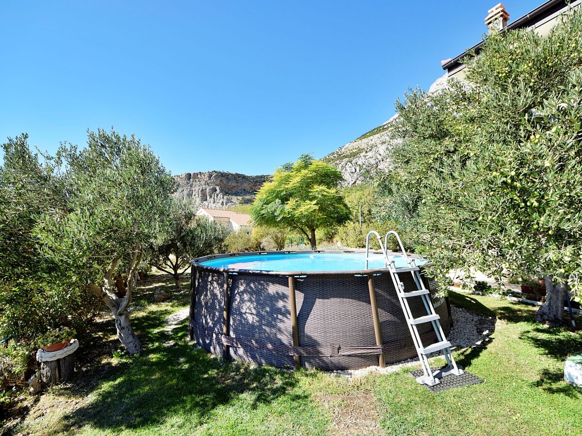 A usage privé: terrain 800 m2, jardin avec pelouse 100 m2, piscine (hors sol) ronde (4.9 m diamètre, profondeur 120 cm, disponibilité saisonnière: 01.Mai.