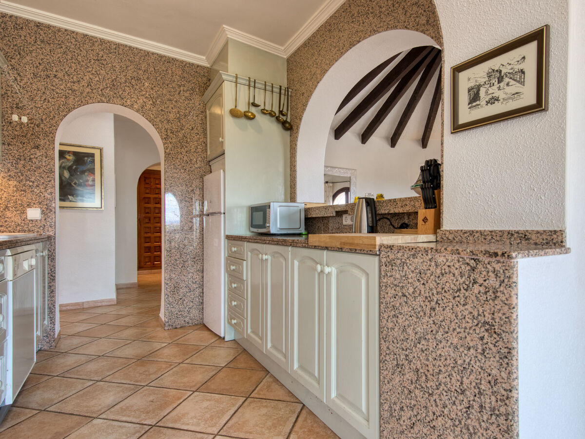 Cuisine ouverte (four, lave-vaisselle, 3 plaques vitrocéramiques, micro-ondes, congélateur, cafetière électrique).